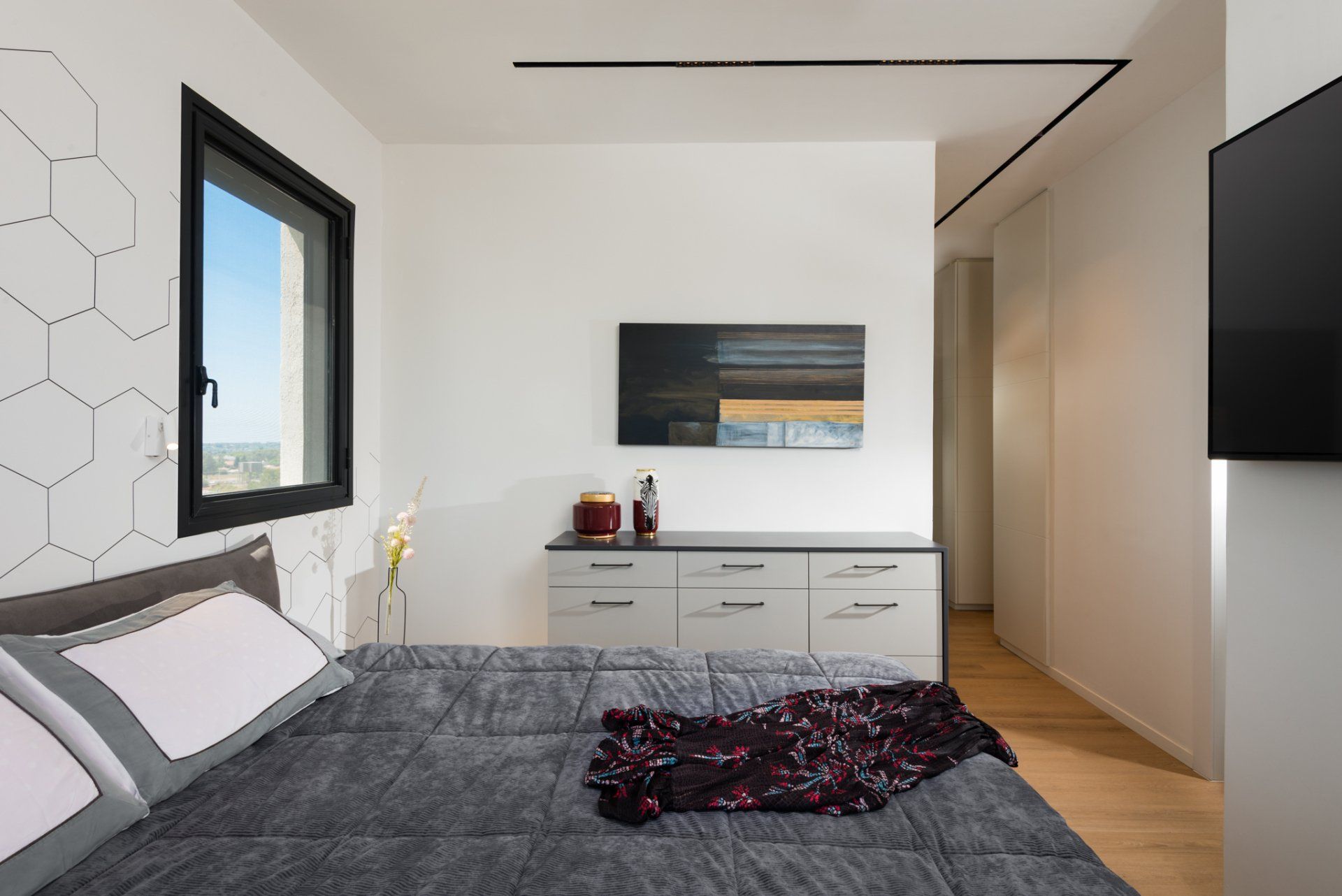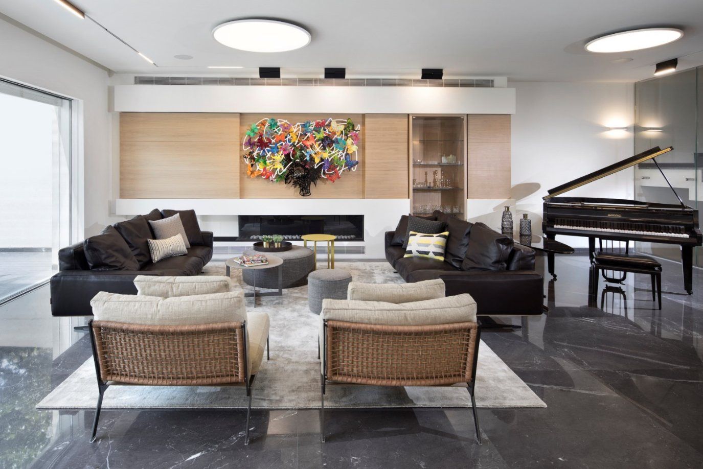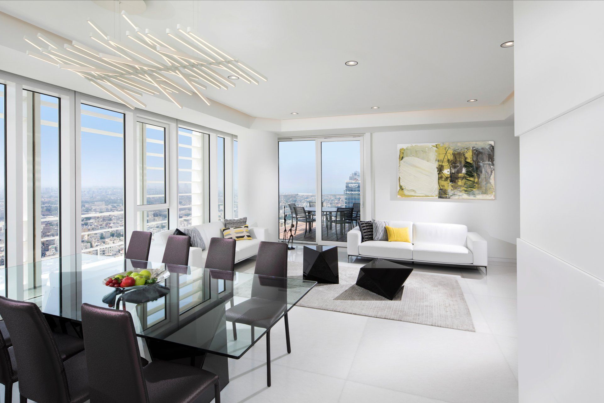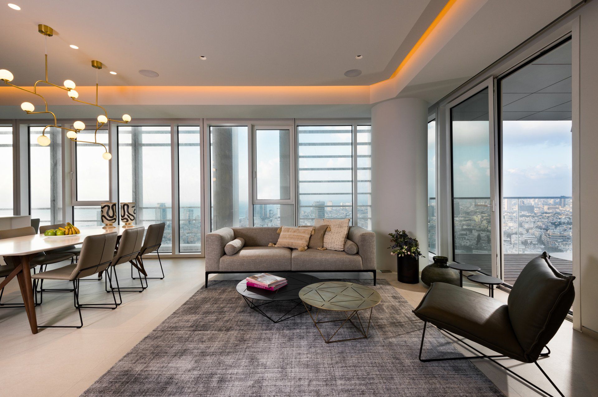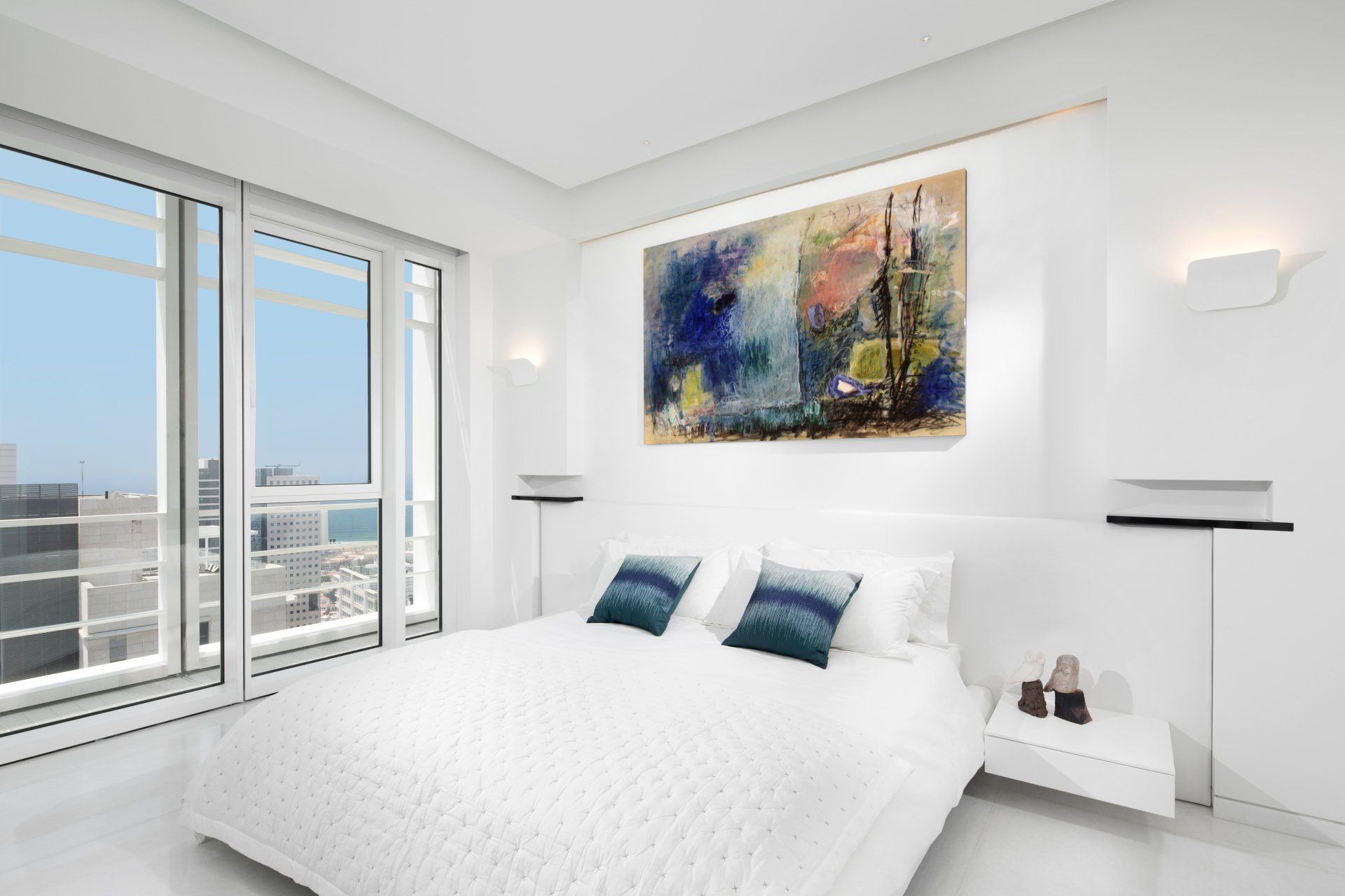 שלושה גוונים מובילים בעיצוב דירת הנופש הזו הנמצאת בלב תל אביב ומשקיפה על כל העיר. שחור, לבן וזהב בהרמוניה המקרינה אלגנטיות מודרנית. בולט במיוחד חיפוי קיר הממ"ד במחומשי עץ המסתירים את חלון ודלת הממ"ד הפונים אל תוך הדירה. שימוש בגופי תאורה המשלימים את העיצוב ומשמשים כמו תכשיט בחלל.