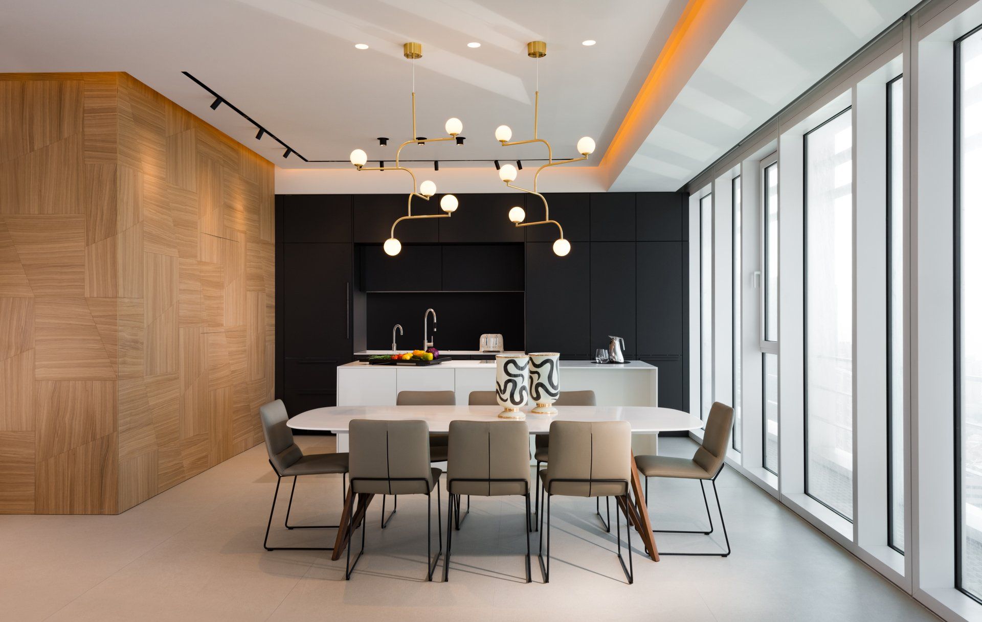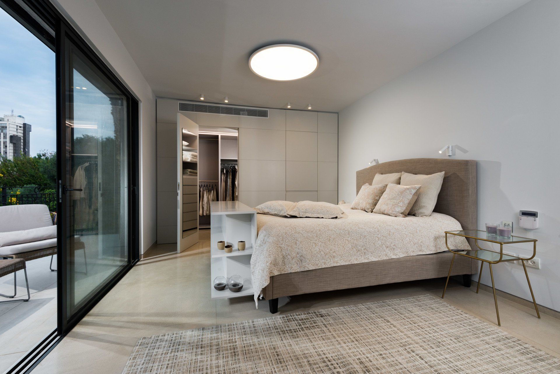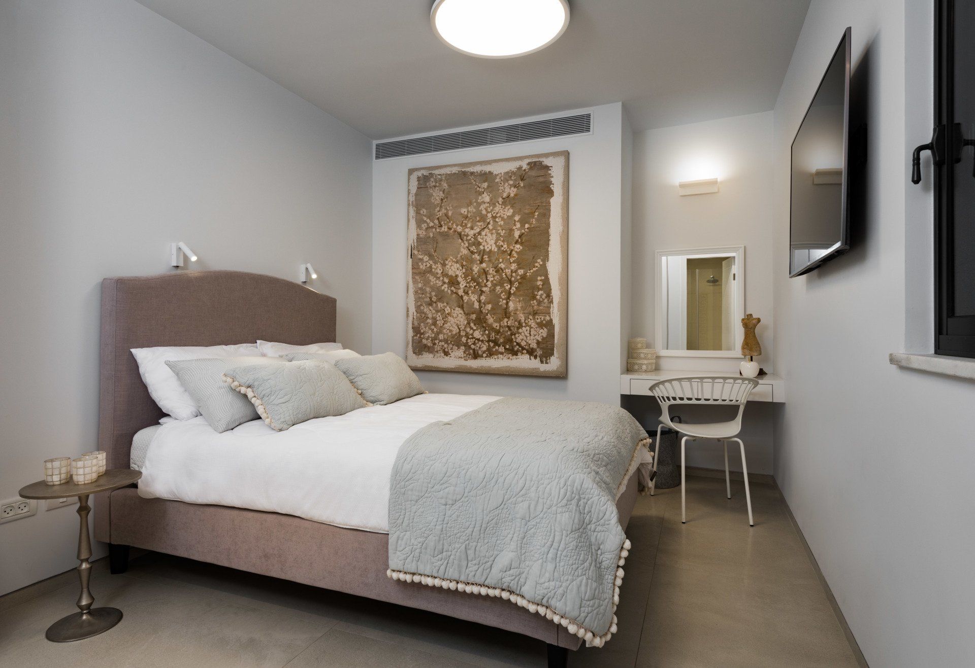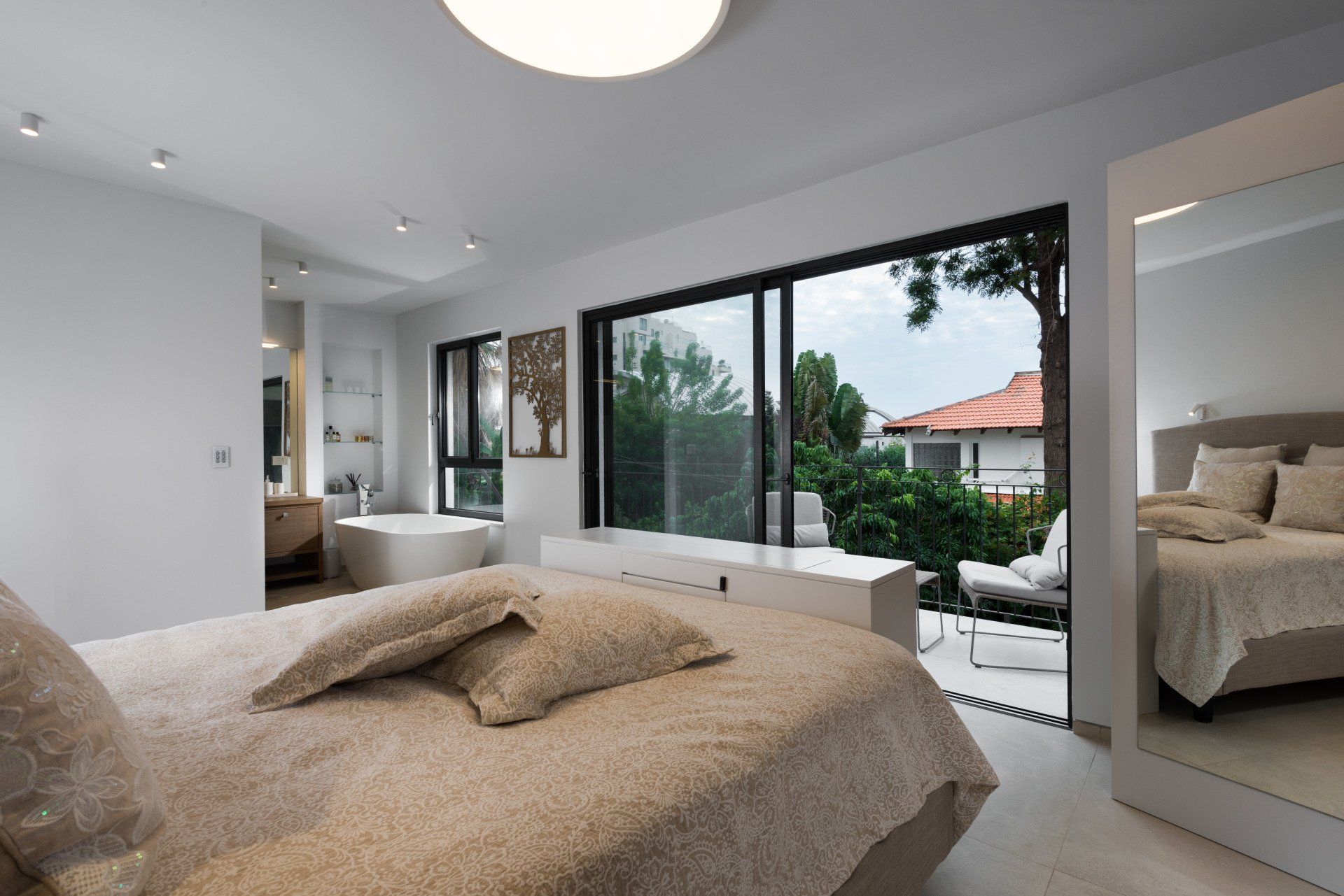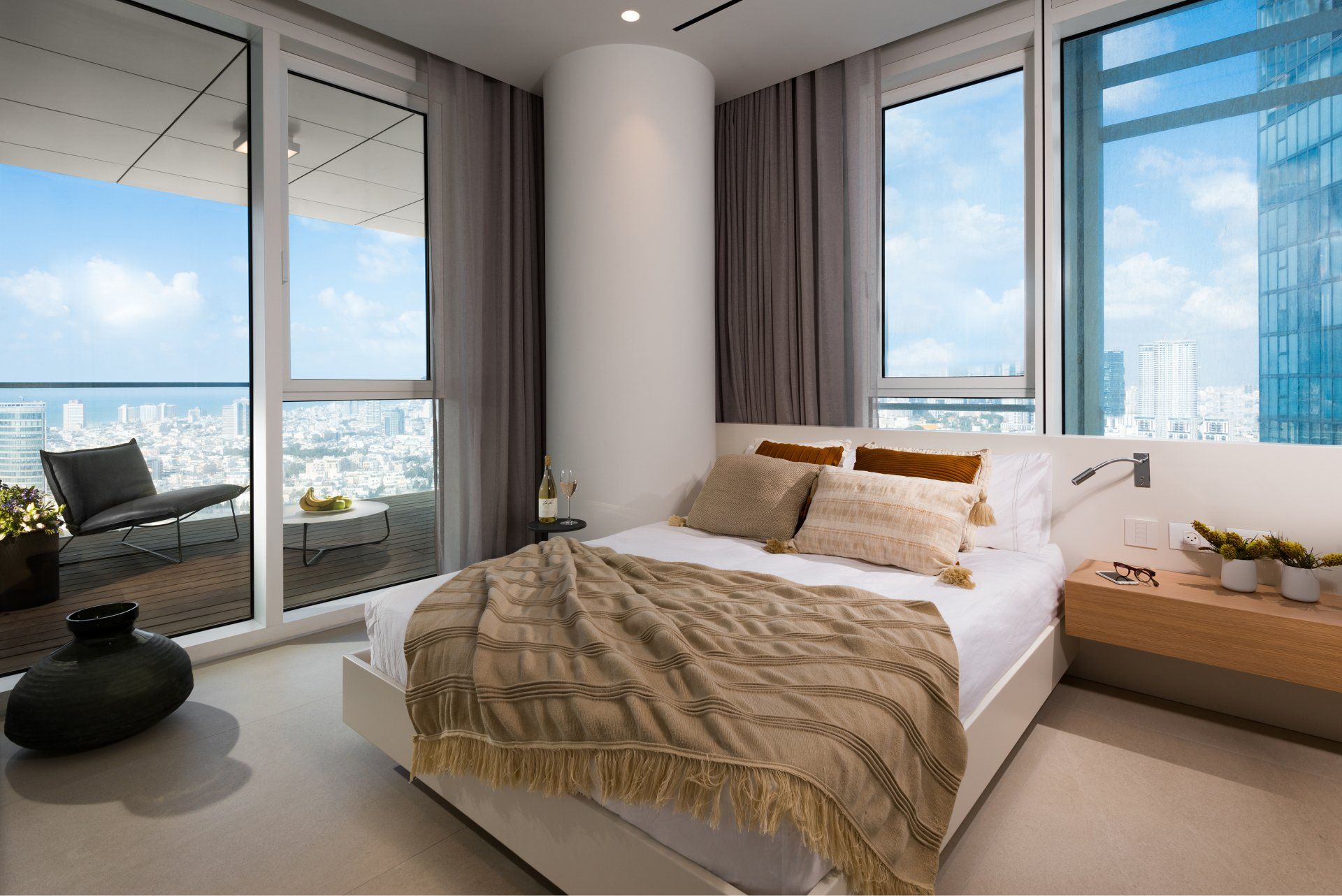 שלושה גוונים מובילים בעיצוב דירת הנופש הזו הנמצאת בלב תל אביב ומשקיפה על כל העיר. שחור, לבן וזהב בהרמוניה המקרינה אלגנטיות מודרנית. בולט במיוחד חיפוי קיר הממ"ד במחומשי עץ המסתירים את חלון ודלת הממ"ד הפונים אל תוך הדירה. שימוש בגופי תאורה המשלימים את העיצוב ומשמשים כמו תכשיט בחלל.