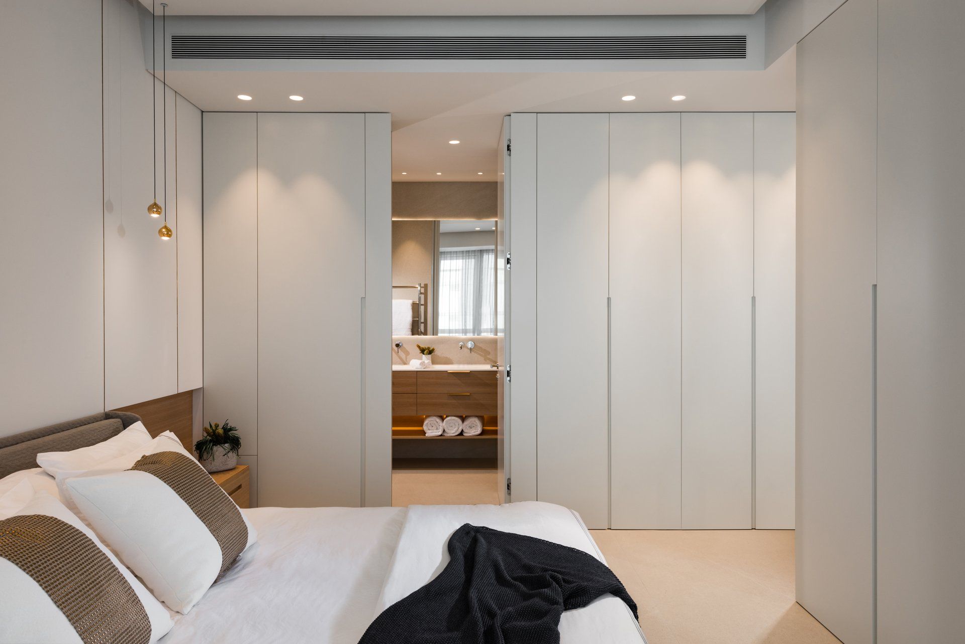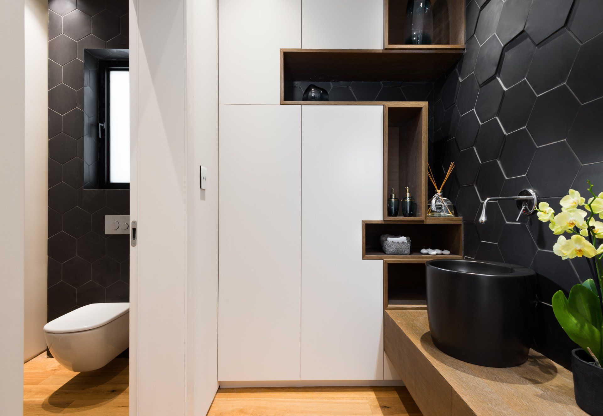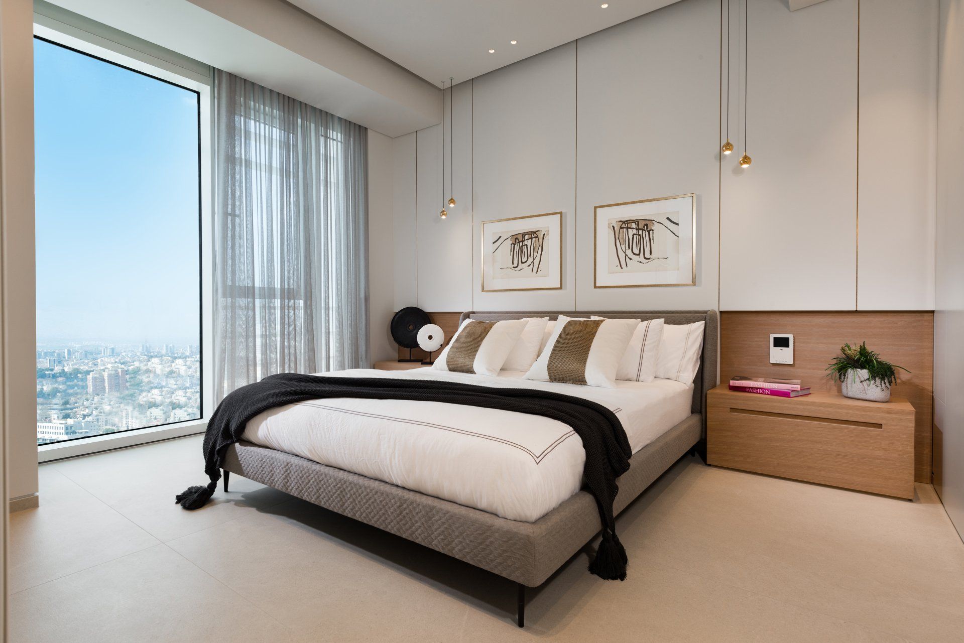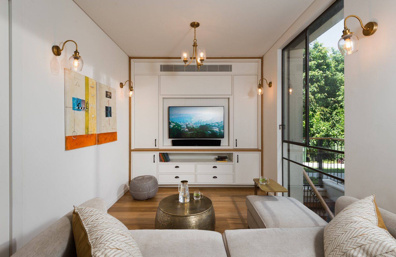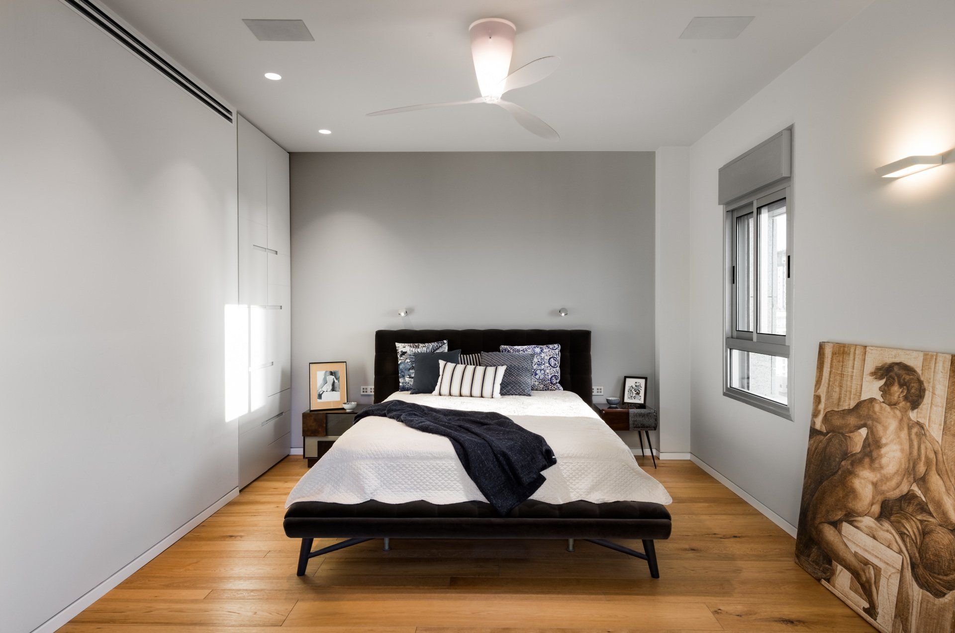 שלושה גוונים מובילים בעיצוב דירת הנופש הזו הנמצאת בלב תל אביב ומשקיפה על כל העיר. שחור, לבן וזהב בהרמוניה המקרינה אלגנטיות מודרנית. בולט במיוחד חיפוי קיר הממ"ד במחומשי עץ המסתירים את חלון ודלת הממ"ד הפונים אל תוך הדירה. שימוש בגופי תאורה המשלימים את העיצוב ומשמשים כמו תכשיט בחלל.
