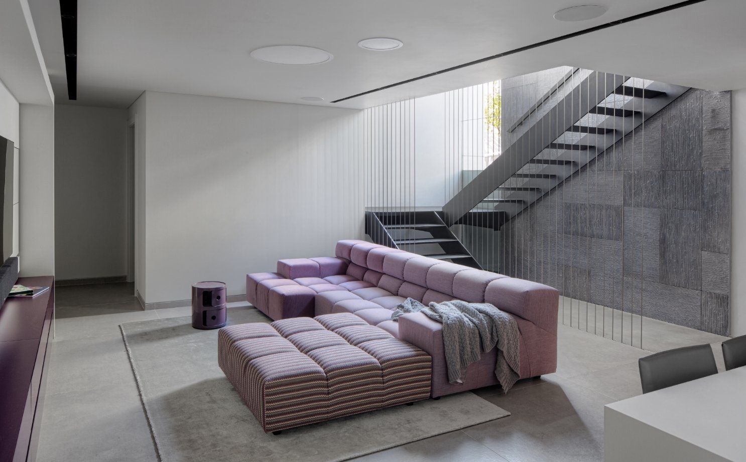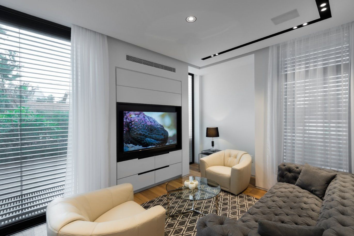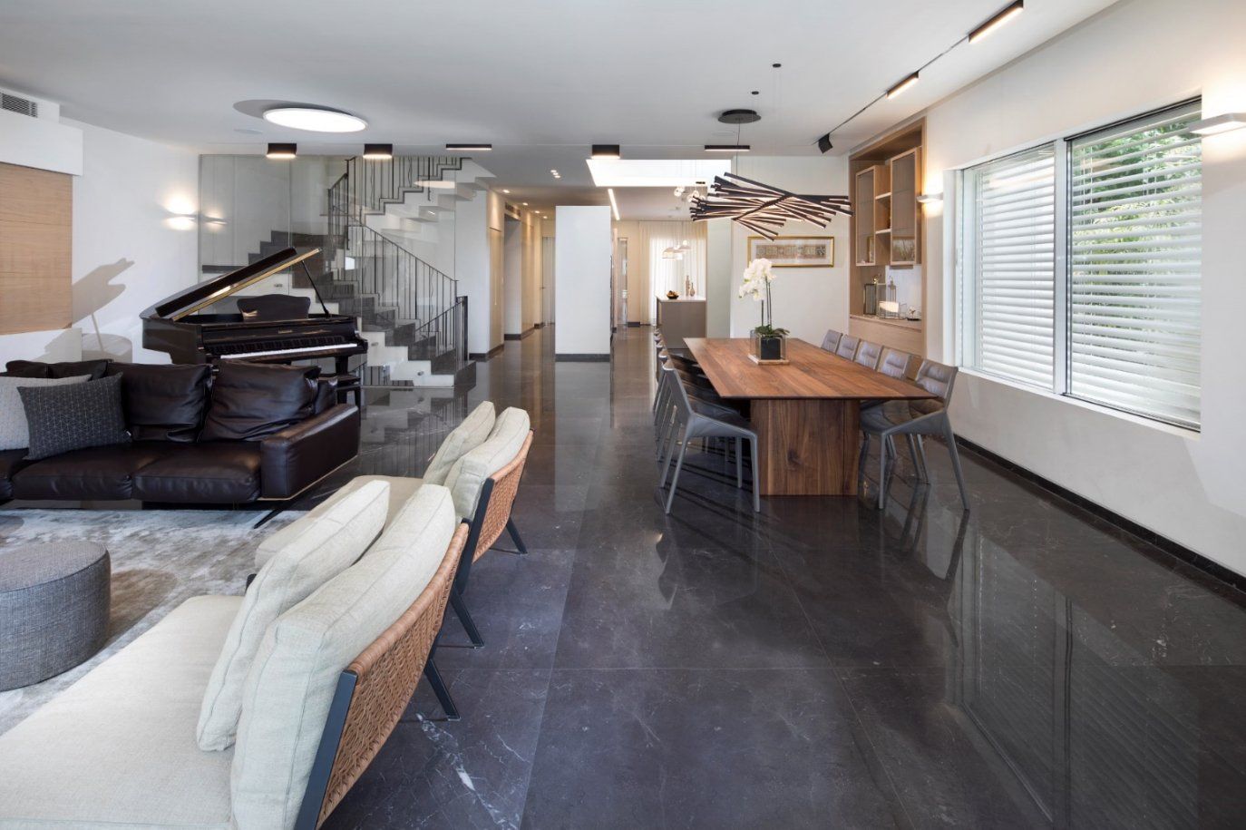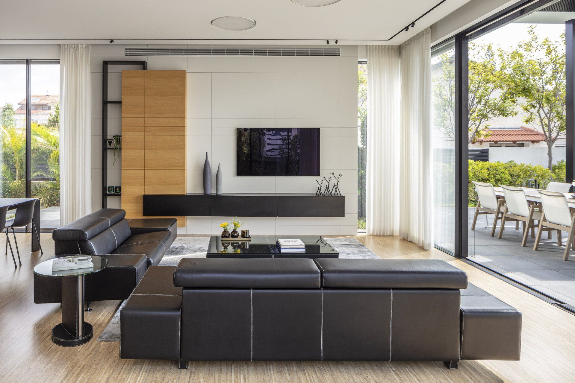 עיצוב חלל פתוח בבית מודרני, כאשר צבעי הרקע הם לבן ושחור וכתמי הצבע הוכנסו דרך הטקסטיל בריהוט הבית. שימוש במדרגה קלה שחורה ומעקה בצורת כבלים אנכים היורדים לגובה כל קומות הבית. קיר גב המדרגה מחופה בטון חשוף. בקומת המרתף תוכנן חלל קולנוע מרווח עם ספת רביצה. חדר השינה של ההורים מתקשר למרפסת חזיתית. בצמוד אליו חדר הרחצה אשר מחופה כולו בפלטות גרניט בגדלים של 3 מטרים.
