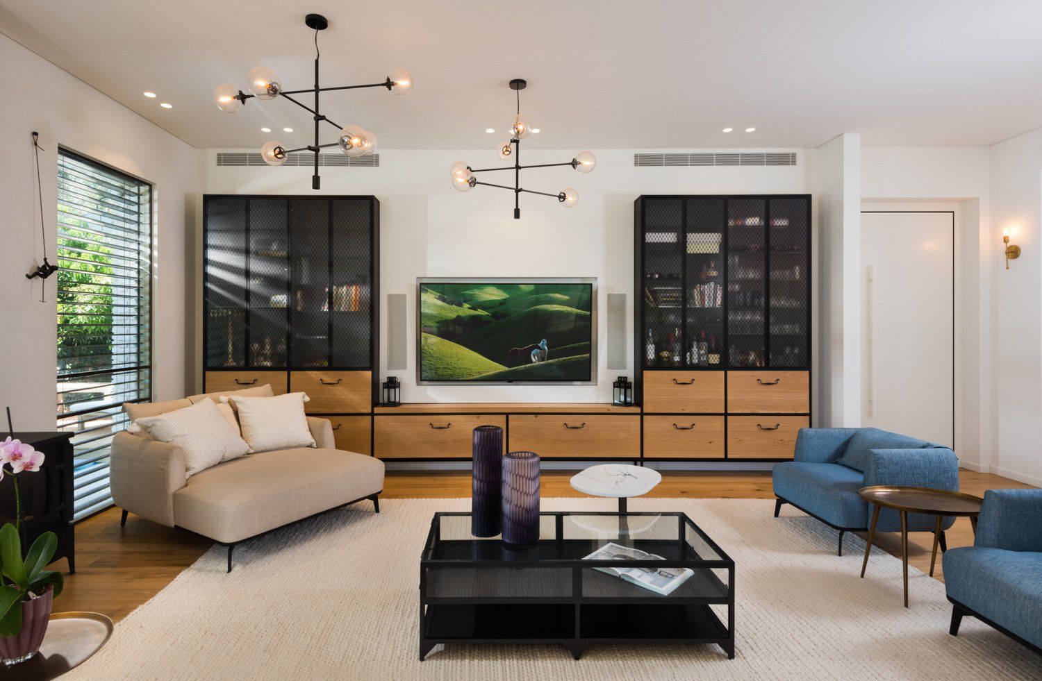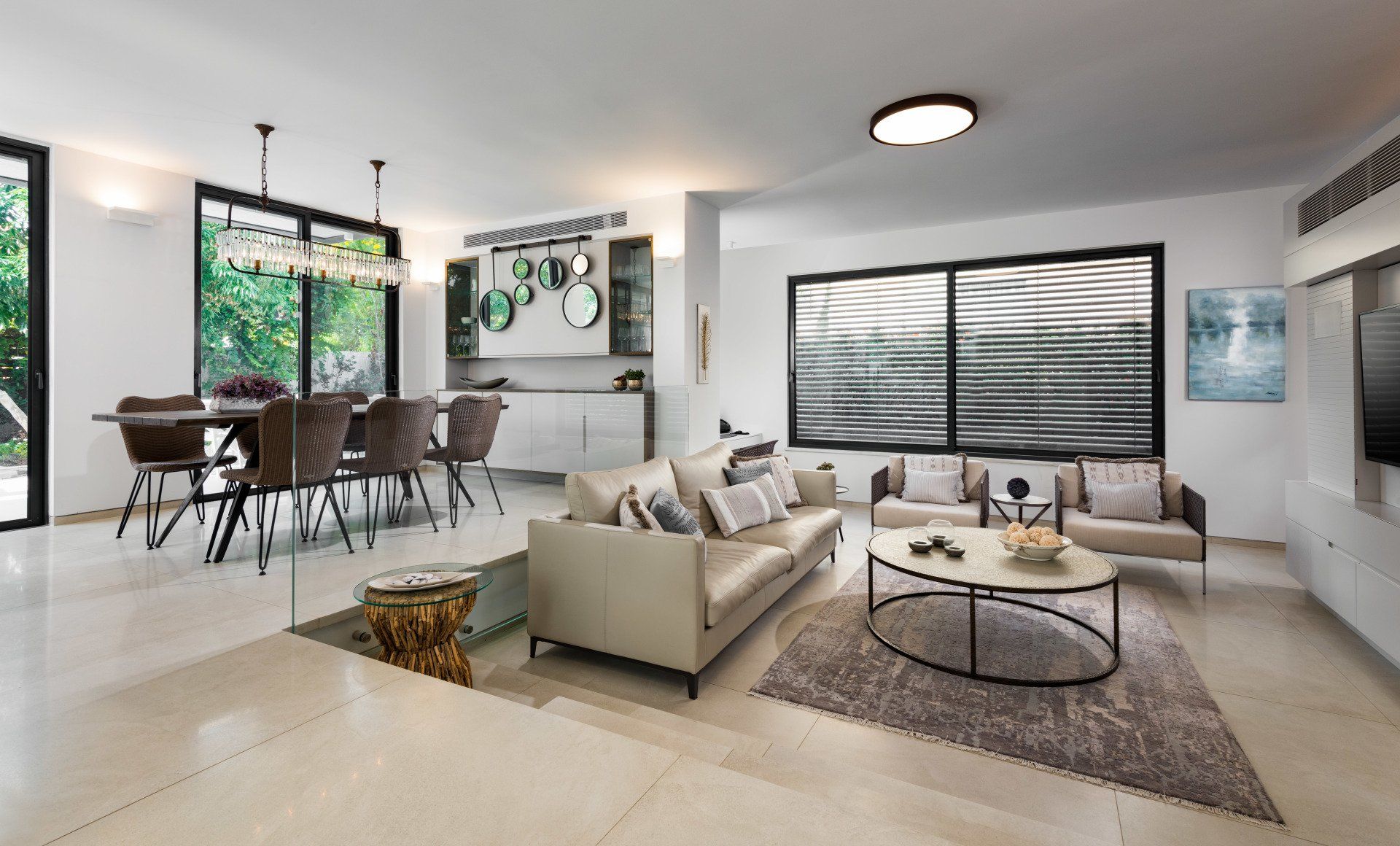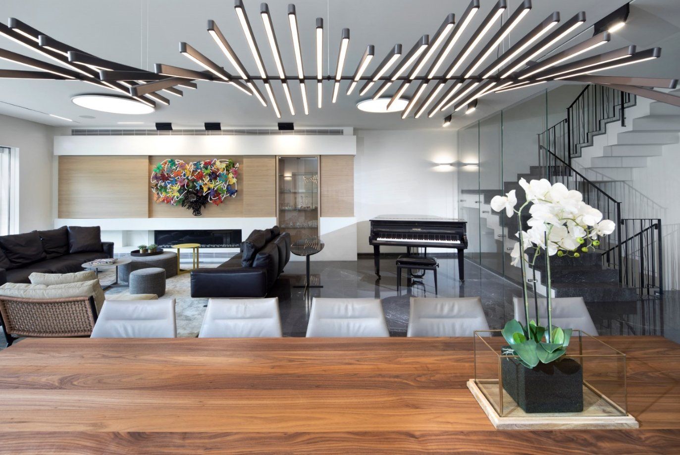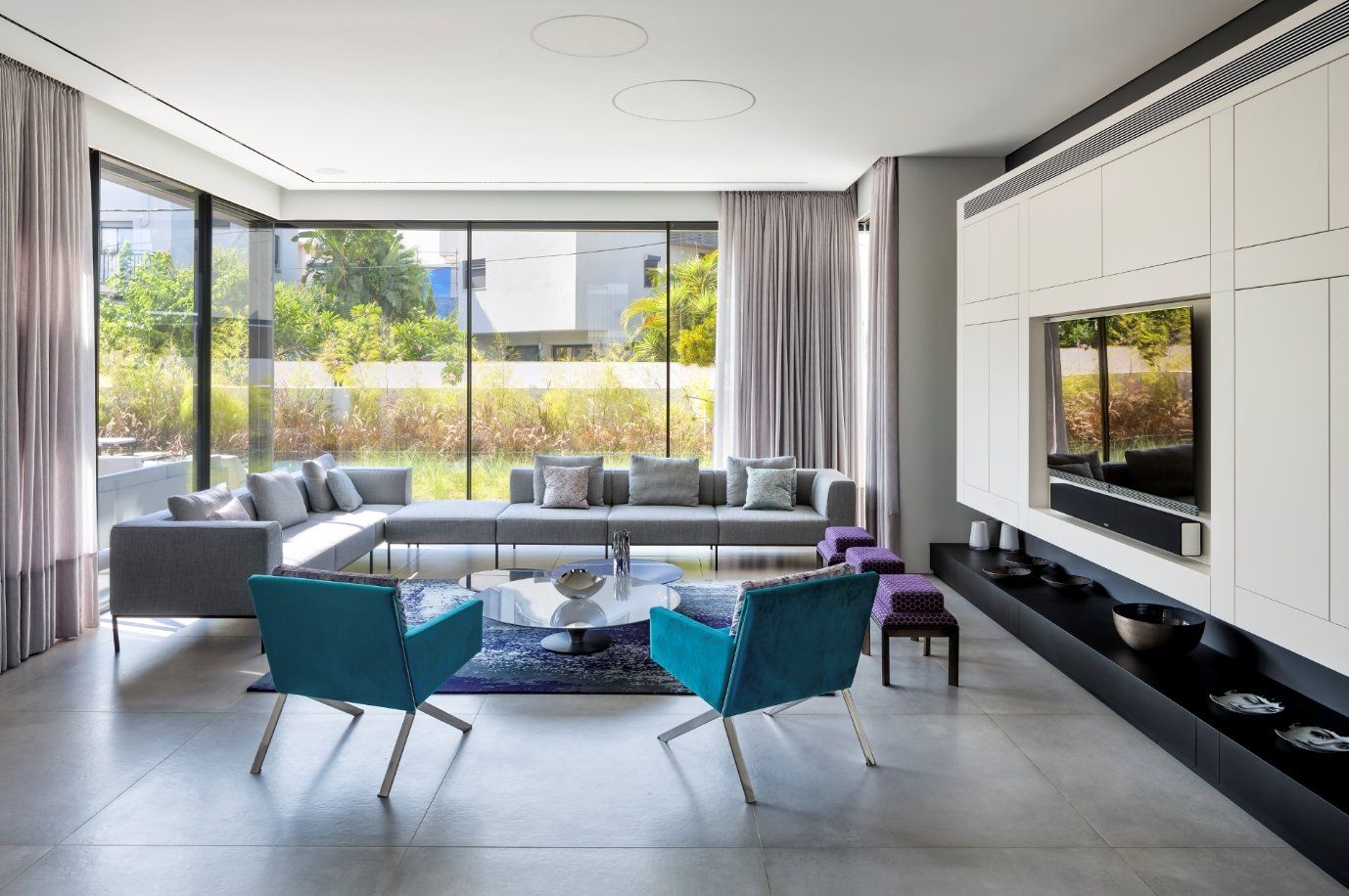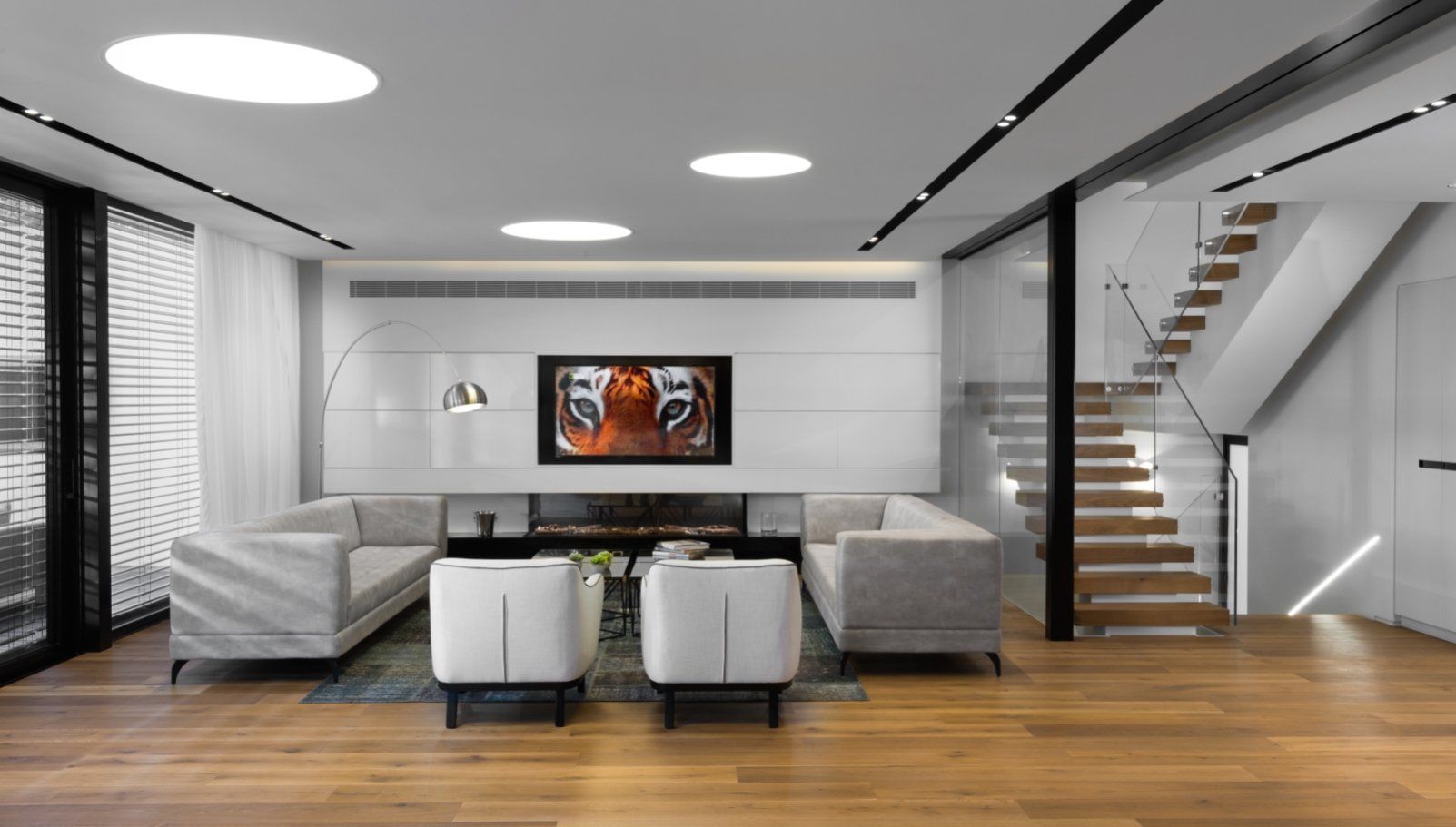עיצוב חלל פתוח בבית מודרני, כאשר צבעי הרקע הם לבן ושחור וכתמי הצבע הוכנסו דרך הטקסטיל בריהוט הבית. שימוש במדרגה קלה שחורה ומעקה בצורת כבלים אנכים היורדים לגובה כל קומות הבית. קיר גב המדרגה מחופה בטון חשוף. בקומת המרתף תוכנן חלל קולנוע מרווח עם ספת רביצה. חדר השינה של ההורים מתקשר למרפסת חזיתית. בצמוד אליו חדר הרחצה אשר מחופה כולו בפלטות גרניט בגדלים של 3 מטרים.