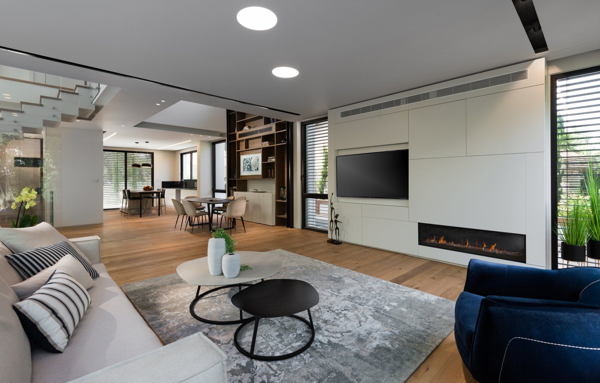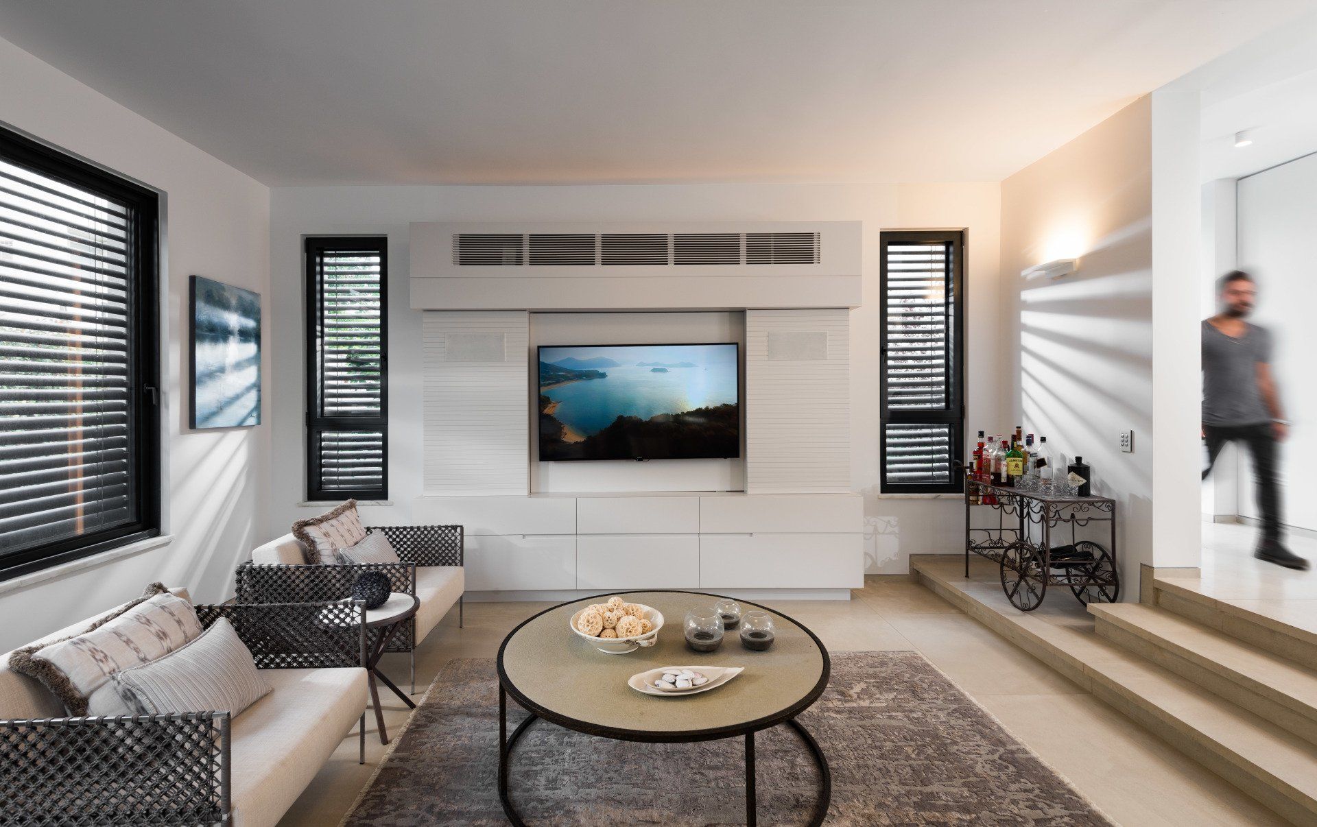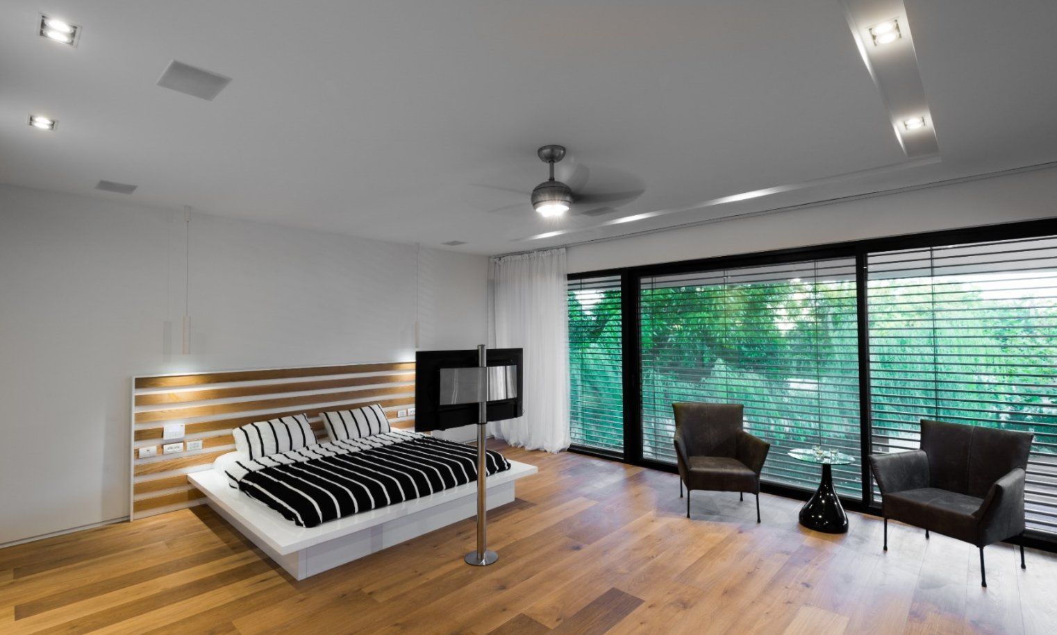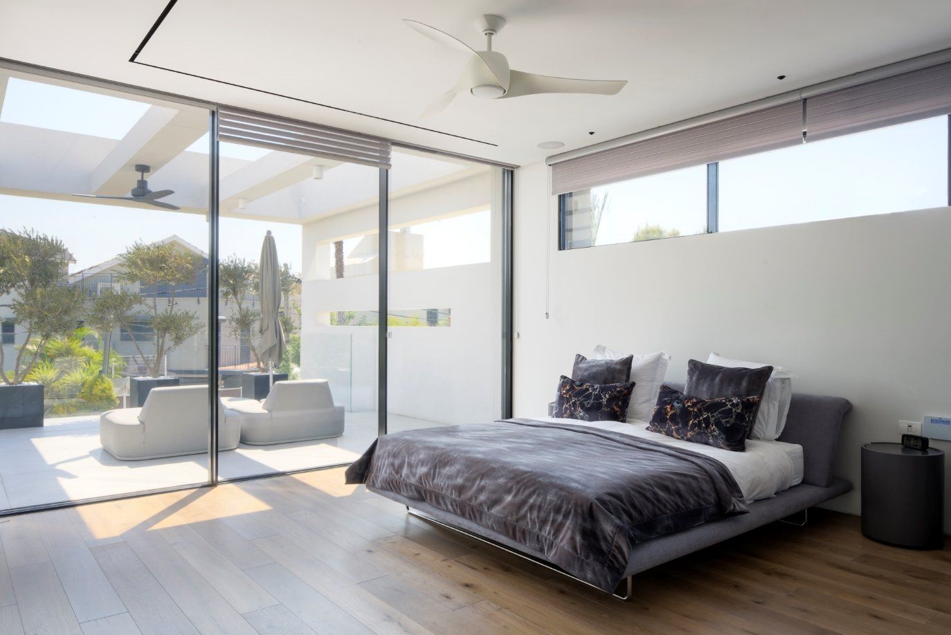 עיצוב חלל פתוח בבית מודרני, כאשר צבעי הרקע הם לבן ושחור וכתמי הצבע הוכנסו דרך הטקסטיל בריהוט הבית. שימוש במדרגה קלה שחורה ומעקה בצורת כבלים אנכים היורדים לגובה כל קומות הבית. קיר גב המדרגה מחופה בטון חשוף. בקומת המרתף תוכנן חלל קולנוע מרווח עם ספת רביצה. חדר השינה של ההורים מתקשר למרפסת חזיתית. בצמוד אליו חדר הרחצה אשר מחופה כולו בפלטות גרניט בגדלים של 3 מטרים.