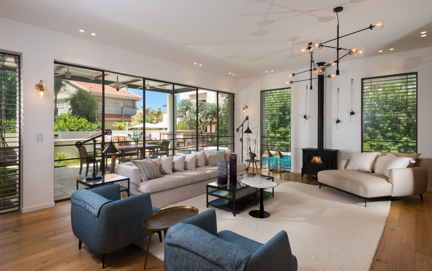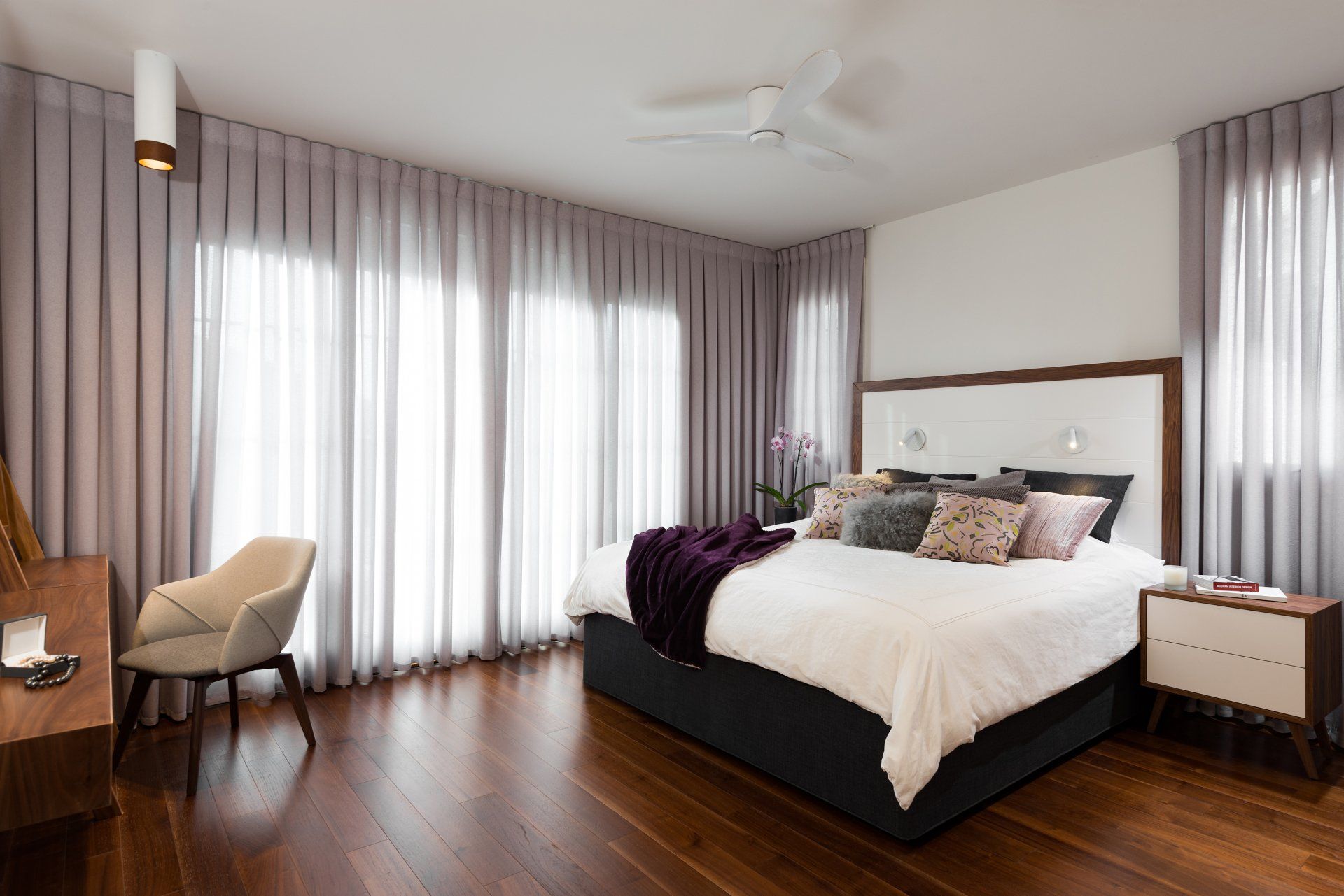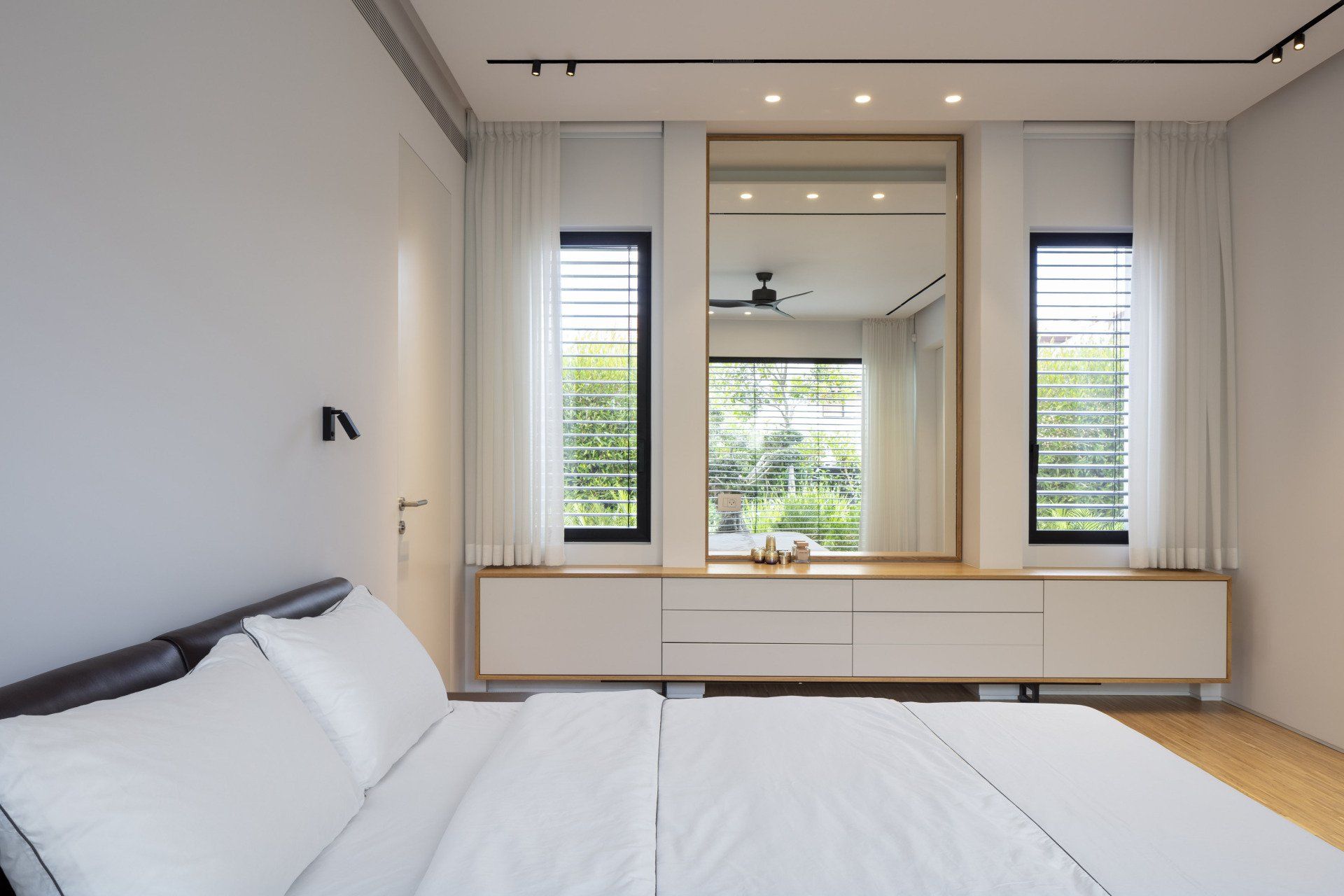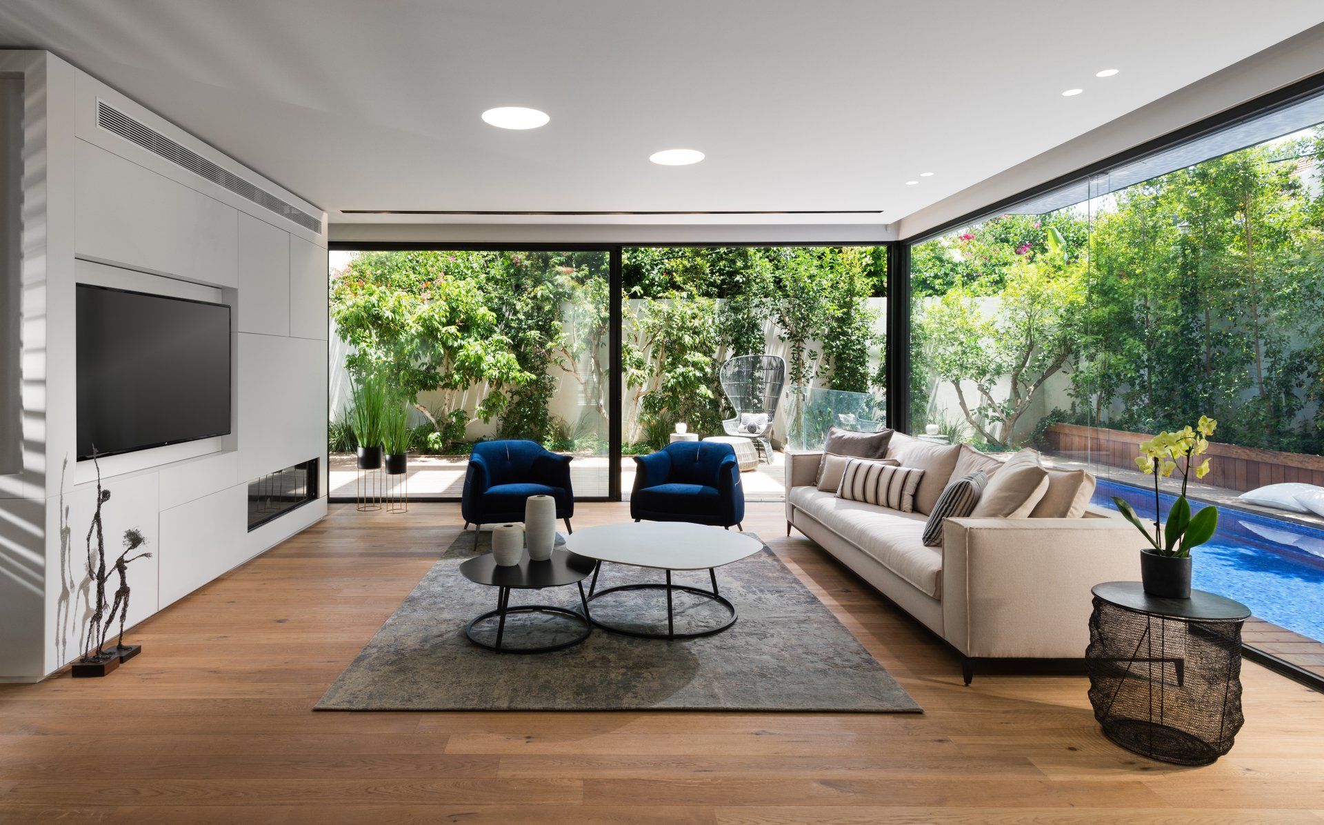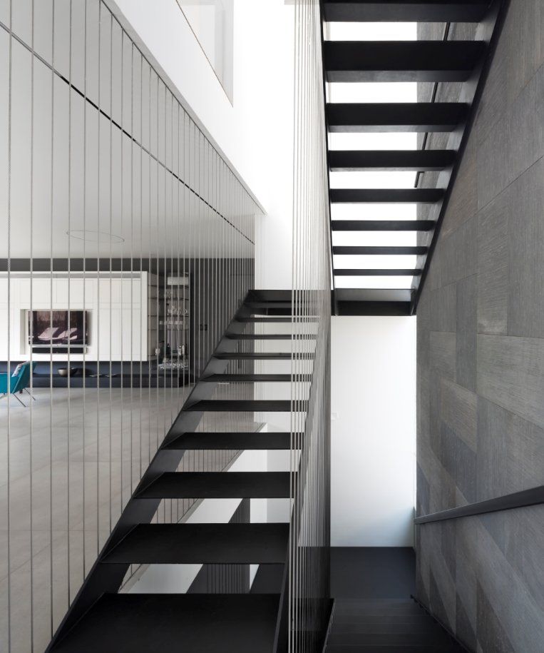 עיצוב חלל פתוח בבית מודרני, כאשר צבעי הרקע הם לבן ושחור וכתמי הצבע הוכנסו דרך הטקסטיל בריהוט הבית. שימוש במדרגה קלה שחורה ומעקה בצורת כבלים אנכים היורדים לגובה כל קומות הבית. קיר גב המדרגה מחופה בטון חשוף. בקומת המרתף תוכנן חלל קולנוע מרווח עם ספת רביצה. חדר השינה של ההורים מתקשר למרפסת חזיתית. בצמוד אליו חדר הרחצה אשר מחופה כולו בפלטות גרניט בגדלים של 3 מטרים.