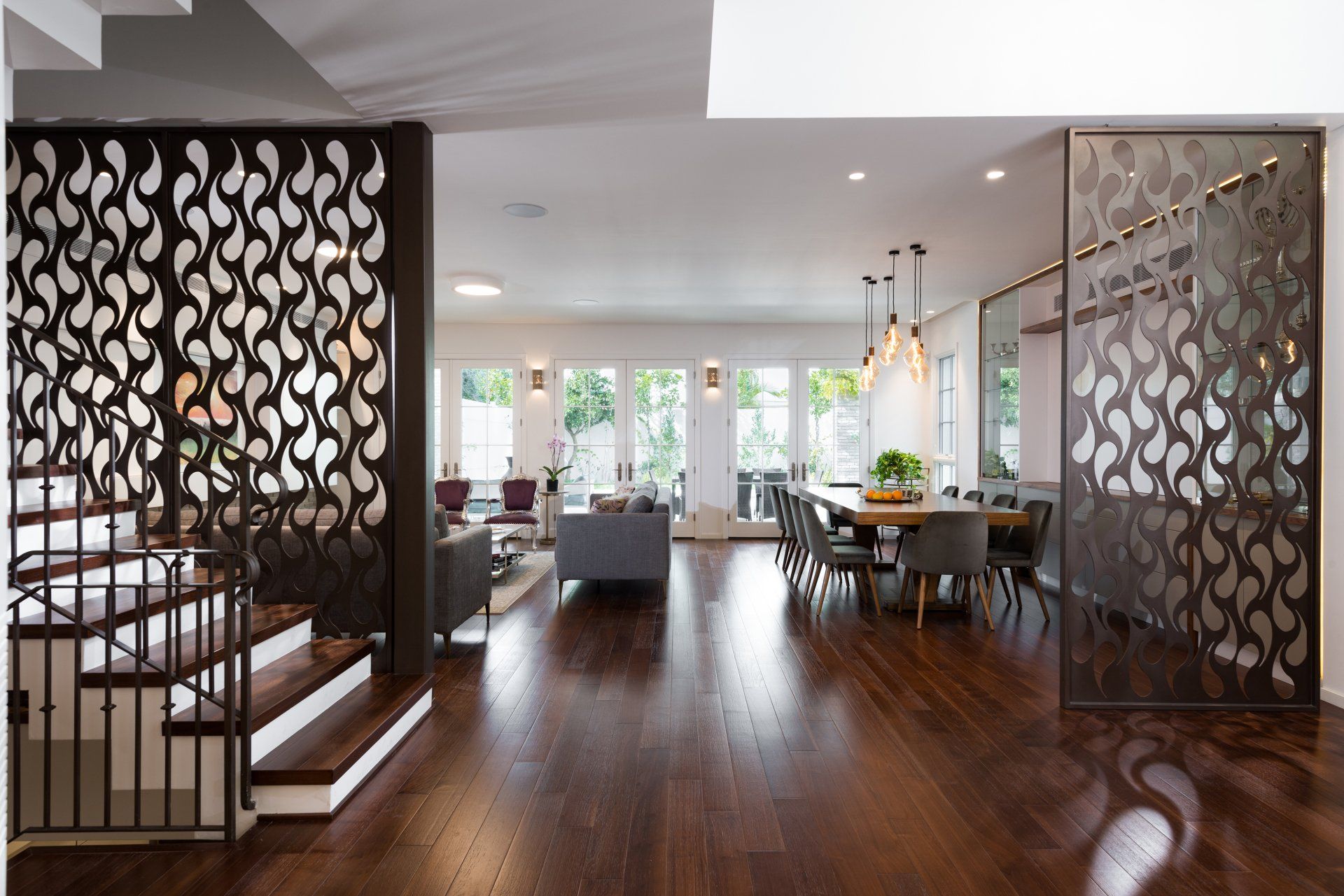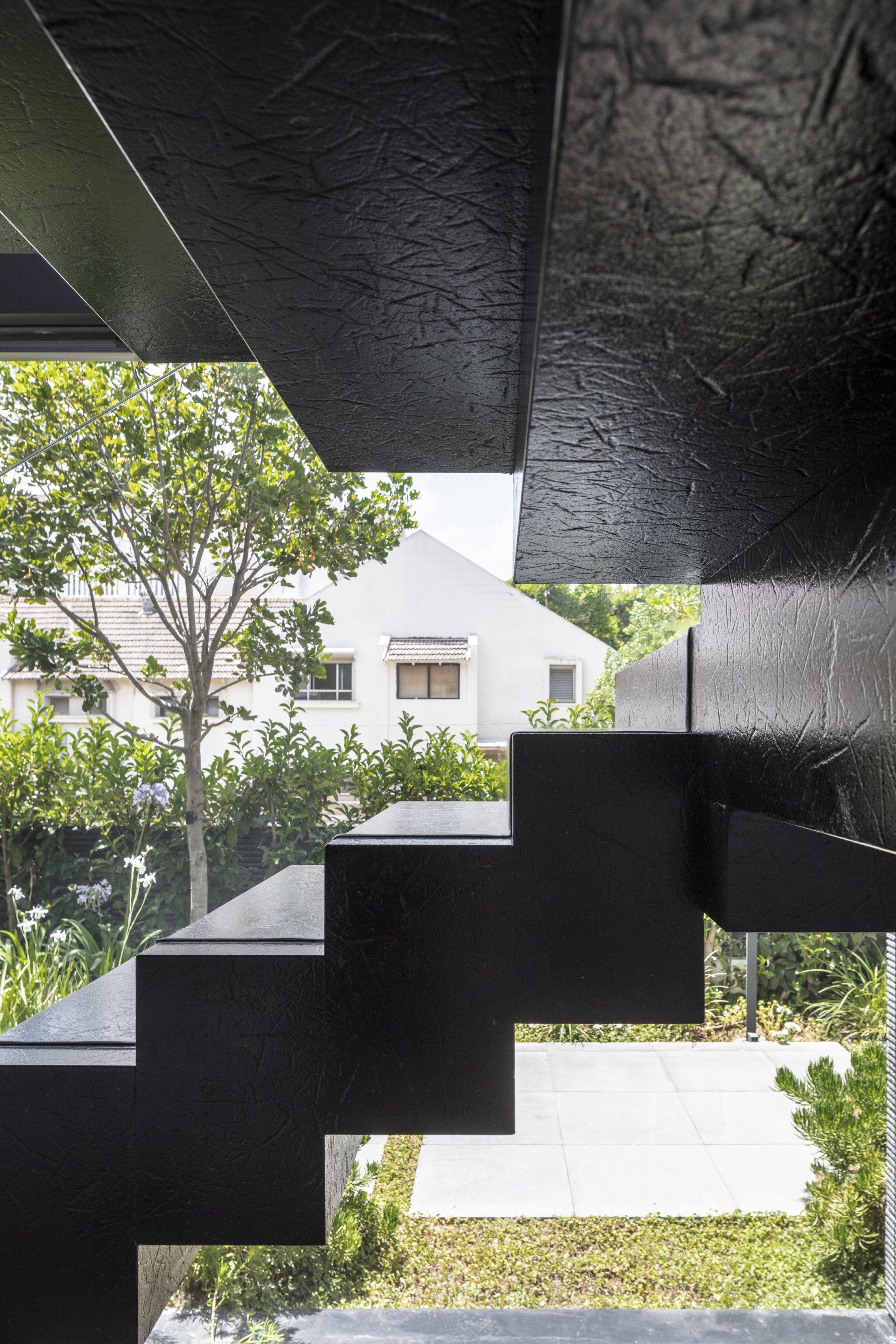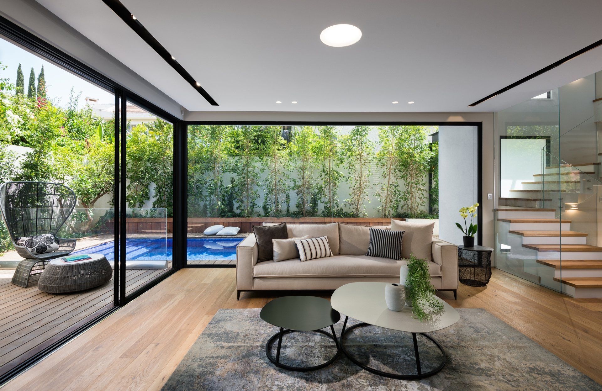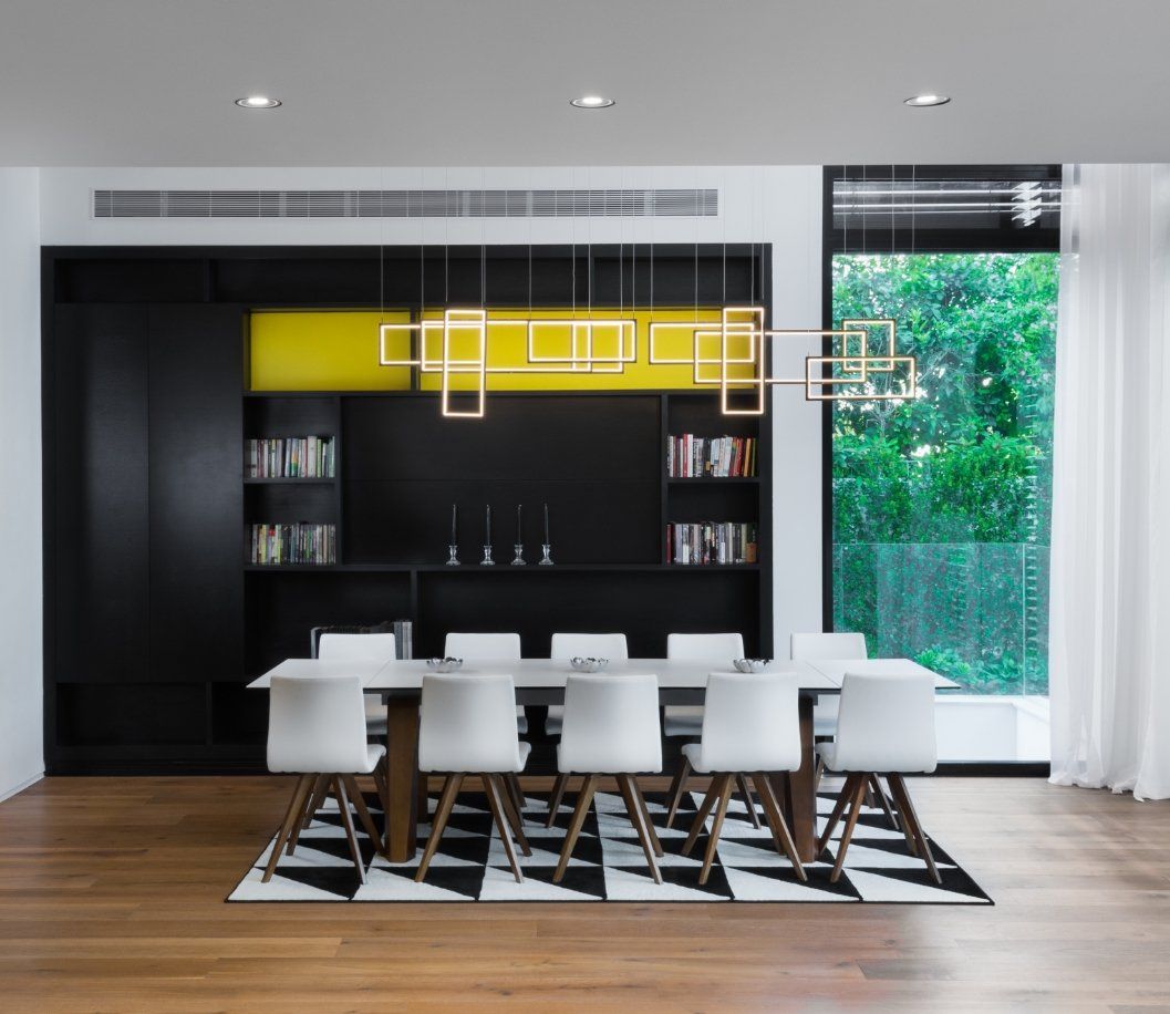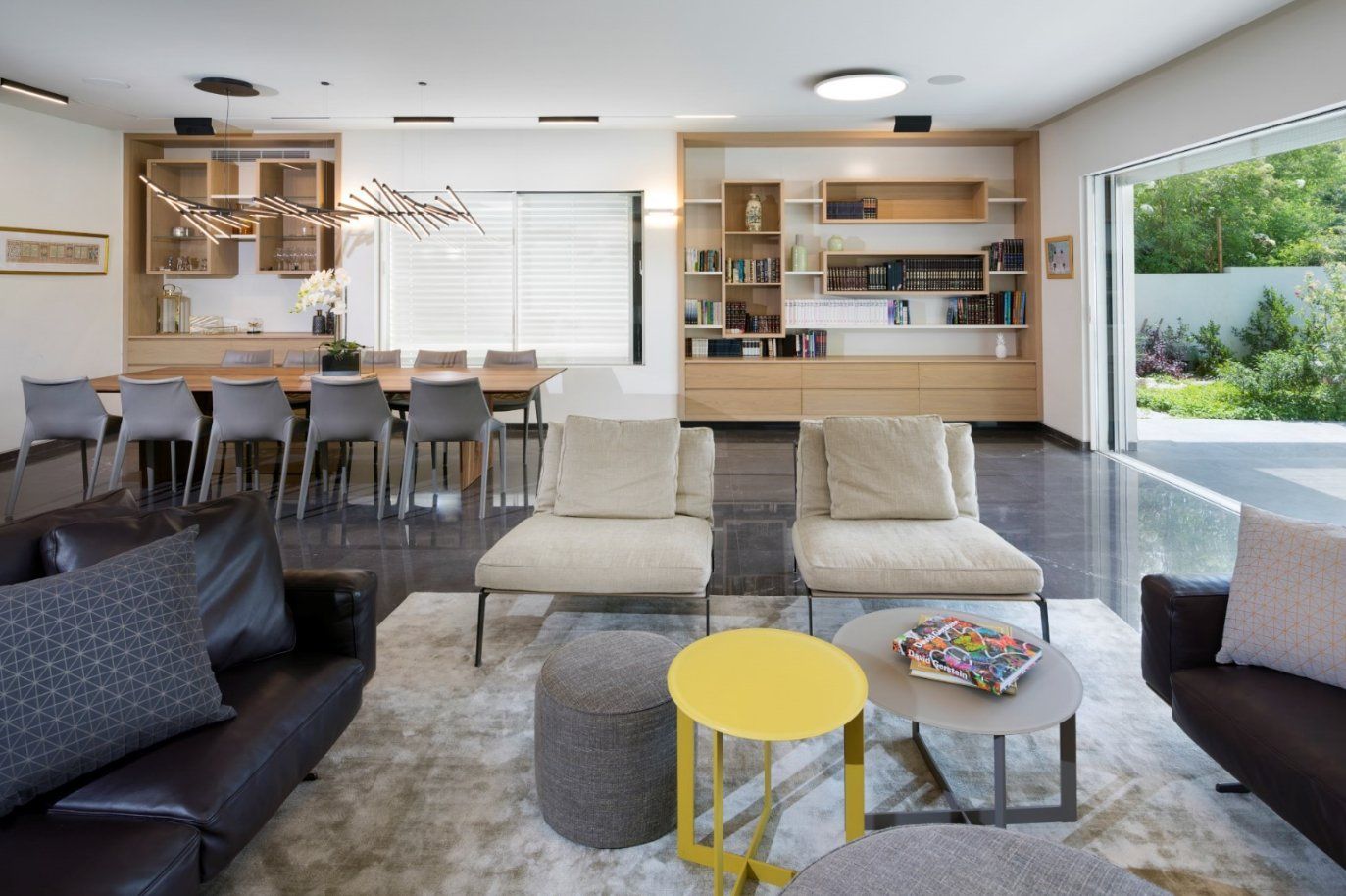 בית מודרני ובו נעשה שימוש בחומרים ובגוונים דומיננטיים – אפור בטון חשוף, שחור לקירות ריהוט ואלמנטים קונסטרוקטיביים ורצפת המטבח. ריכוך ע"י רצפת ומדרגות עץ שהמשכם יוצא אל החצר הגדולה. שימוש בטקסטיל כגון שטיחים ווילונות קלים ומודרניים. עיצוב קיר ספרייה שחור בפינת האוכל בגובה שתי קומות. הקיר מכיל פונקציות רבות ומקום ליצירת אמנות בחלקו העליון. שבירת השחור ע"י הכנסת כתמי צבע צהובים.