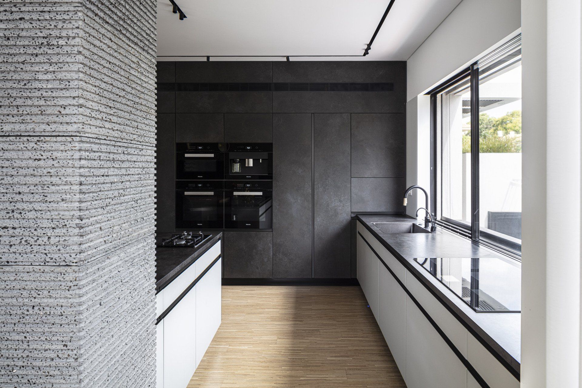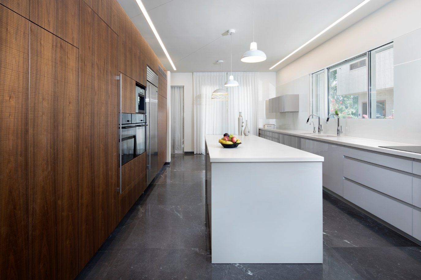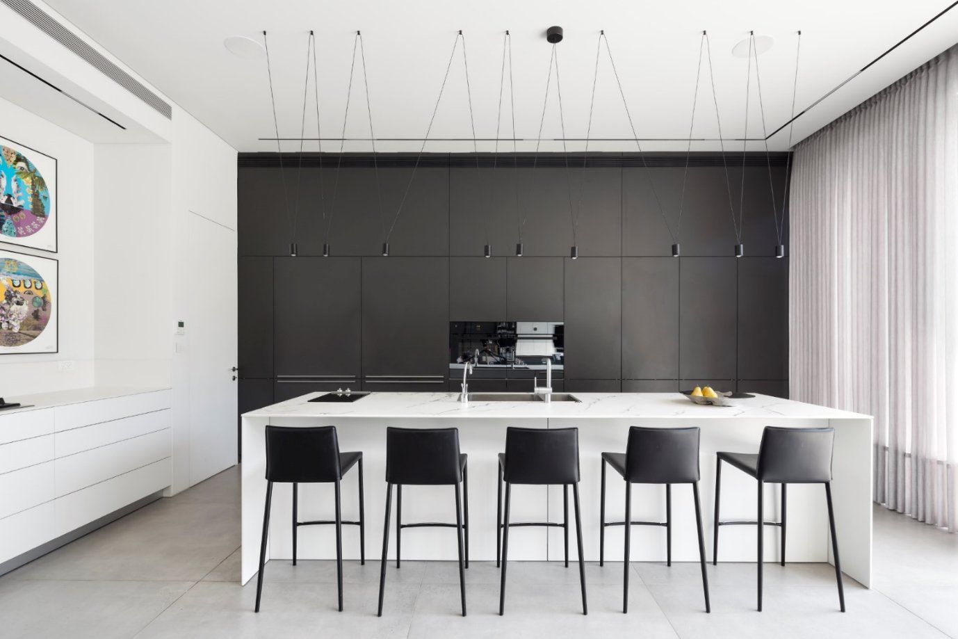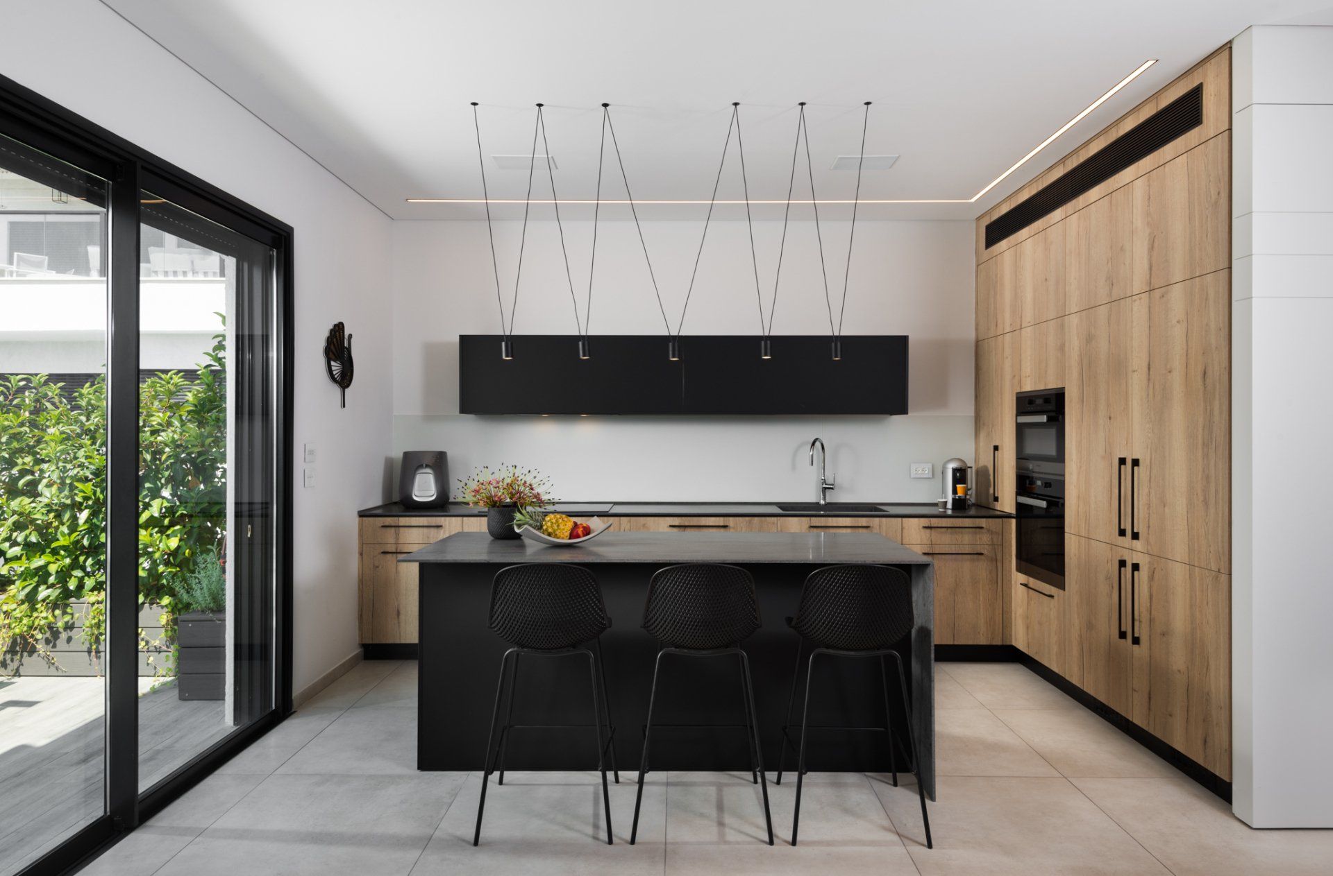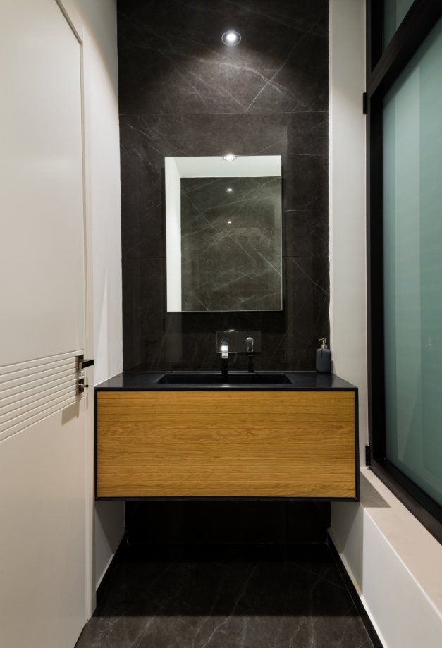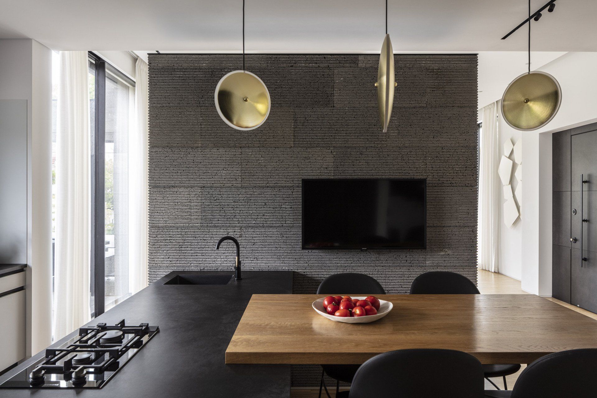 בית של קונטרסטים - מודרני בועט ומשלב בתוכו חומרים חמים טבעיים. שימוש בשחור לבן ועץ במנעד רחב של חומרים, גרניט, אבן, עור, עץ אלון ופרקט יחודי. החומריות של חומרי החוץ חודרת פנימה ויוצרת את העולם העיצובי הפנימי של הבית.