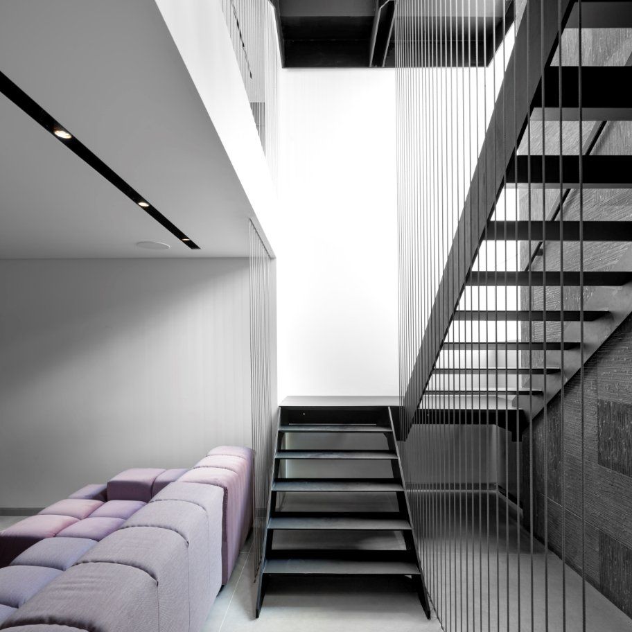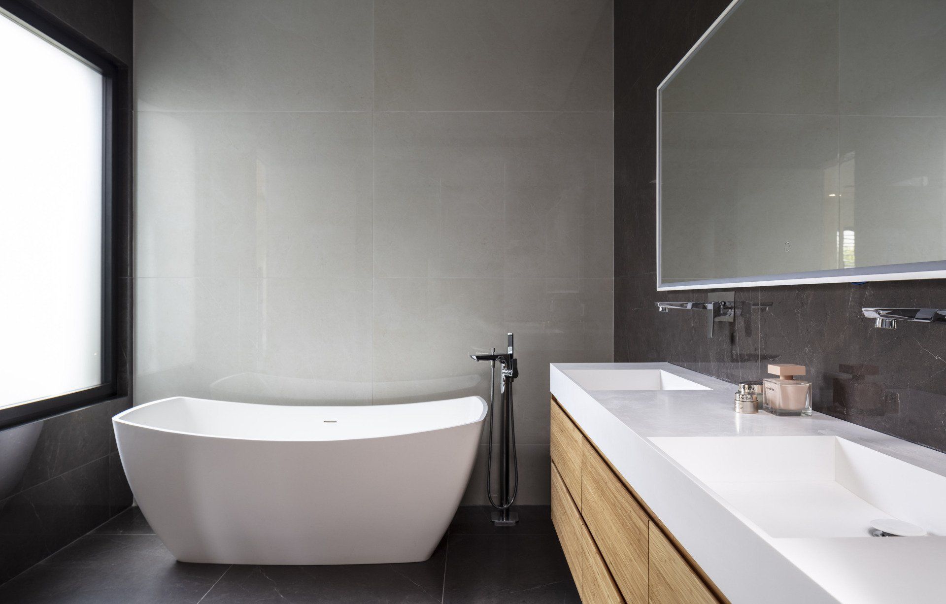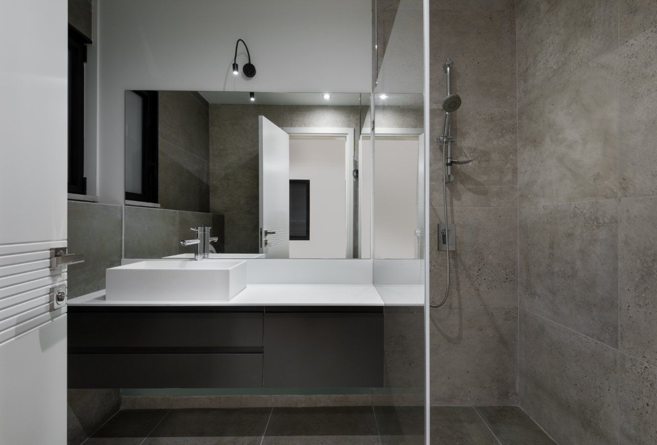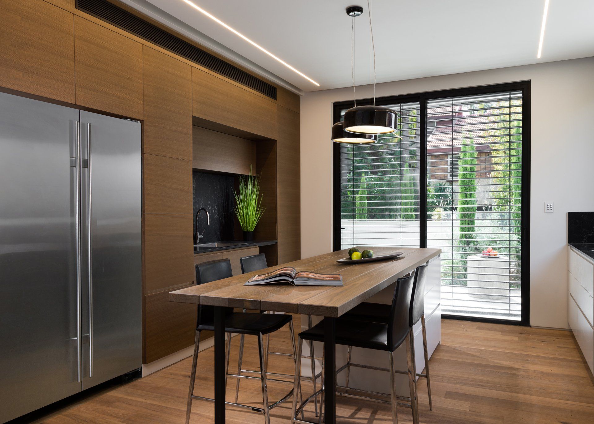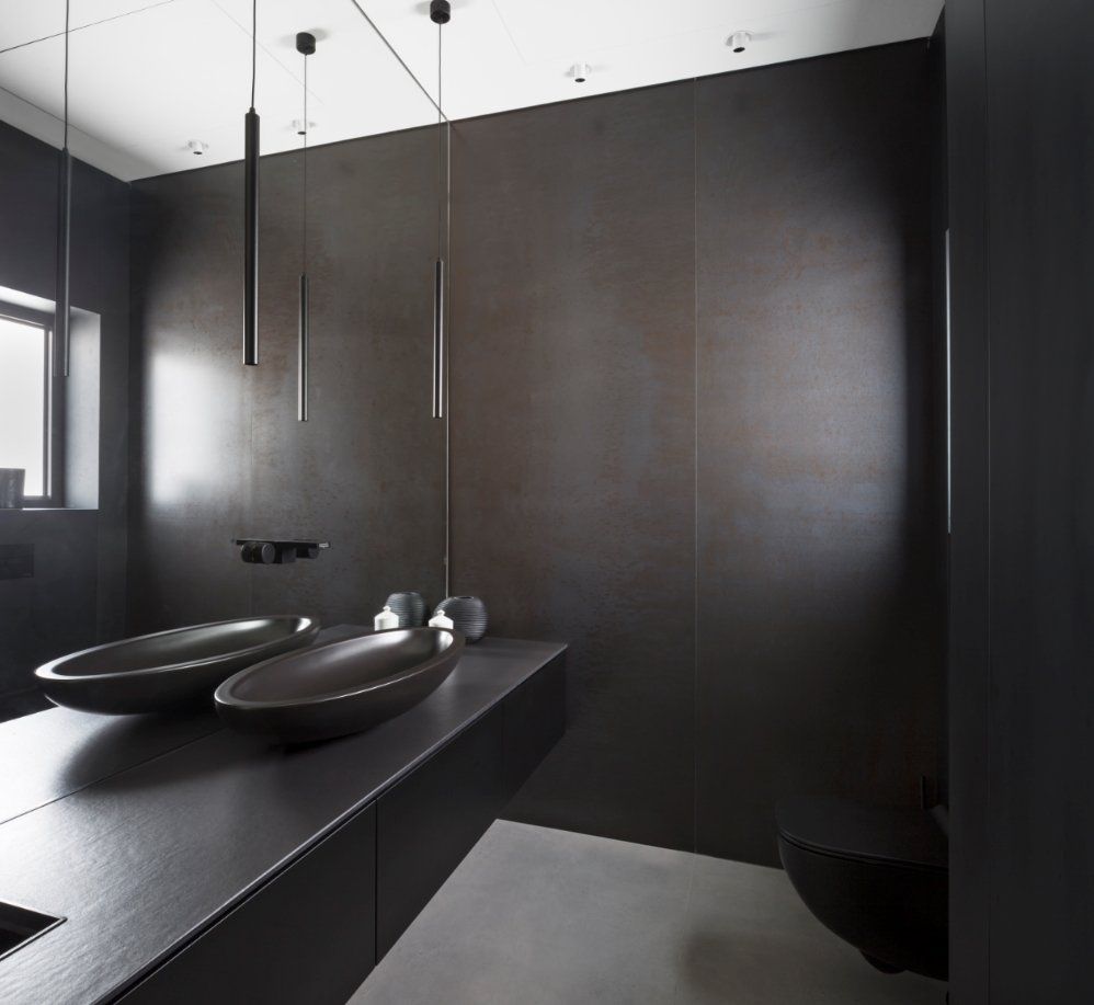 בית של קונטרסטים - מודרני בועט ומשלב בתוכו חומרים חמים טבעיים. שימוש בשחור לבן ועץ במנעד רחב של חומרים, גרניט, אבן, עור, עץ אלון ופרקט יחודי. החומריות של חומרי החוץ חודרת פנימה ויוצרת את העולם העיצובי הפנימי של הבית.