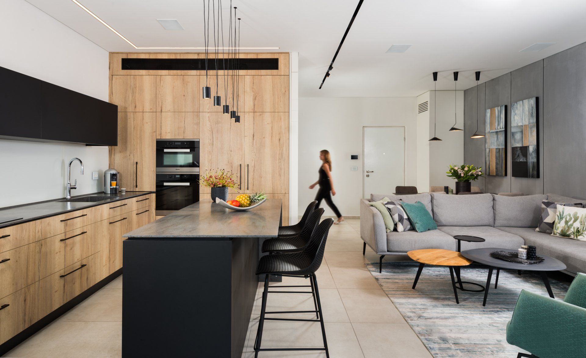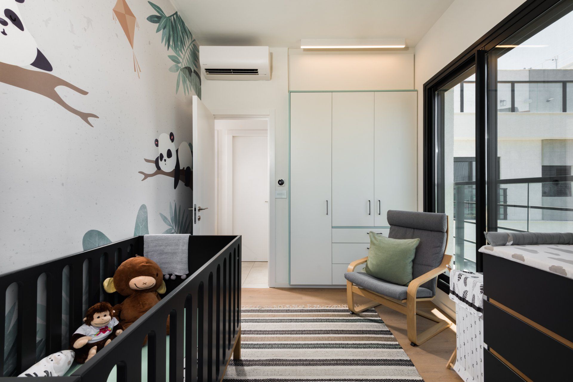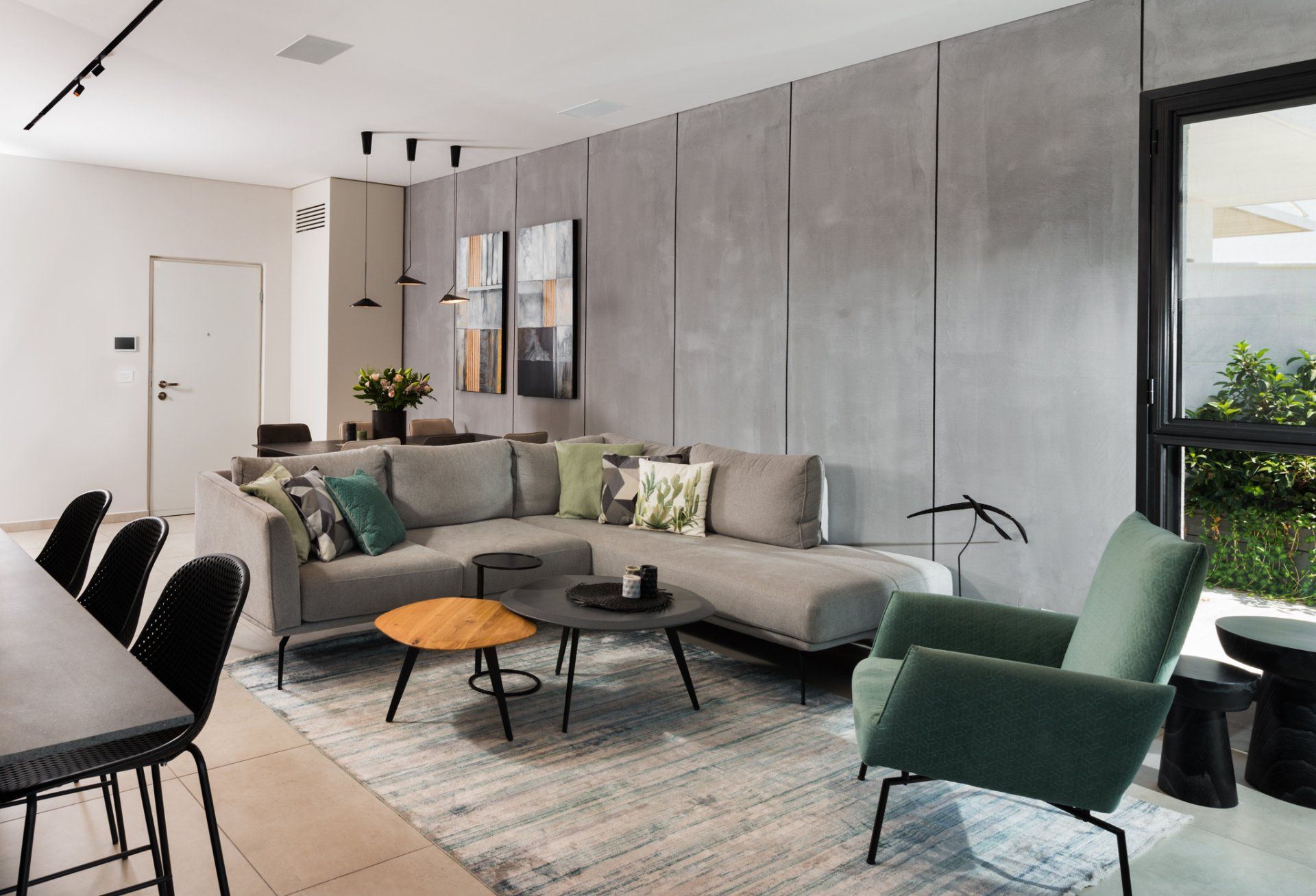 מיני פנטהאוז למשפחה צעירה בסגנון מודרני וצעיר. פלטת החומרים והצבעים משלבת חומרים טבעיים של עץ ובטון אל מול קונטרסט של שחור לבן ושימוש חוזר בצבע ירוק מנטה. חיפוי נגרות, בטון וטפטים משולבים בכל חלקי הדירה ומכניסים פן עיצובי נוסף ודומיננטי בדירה.