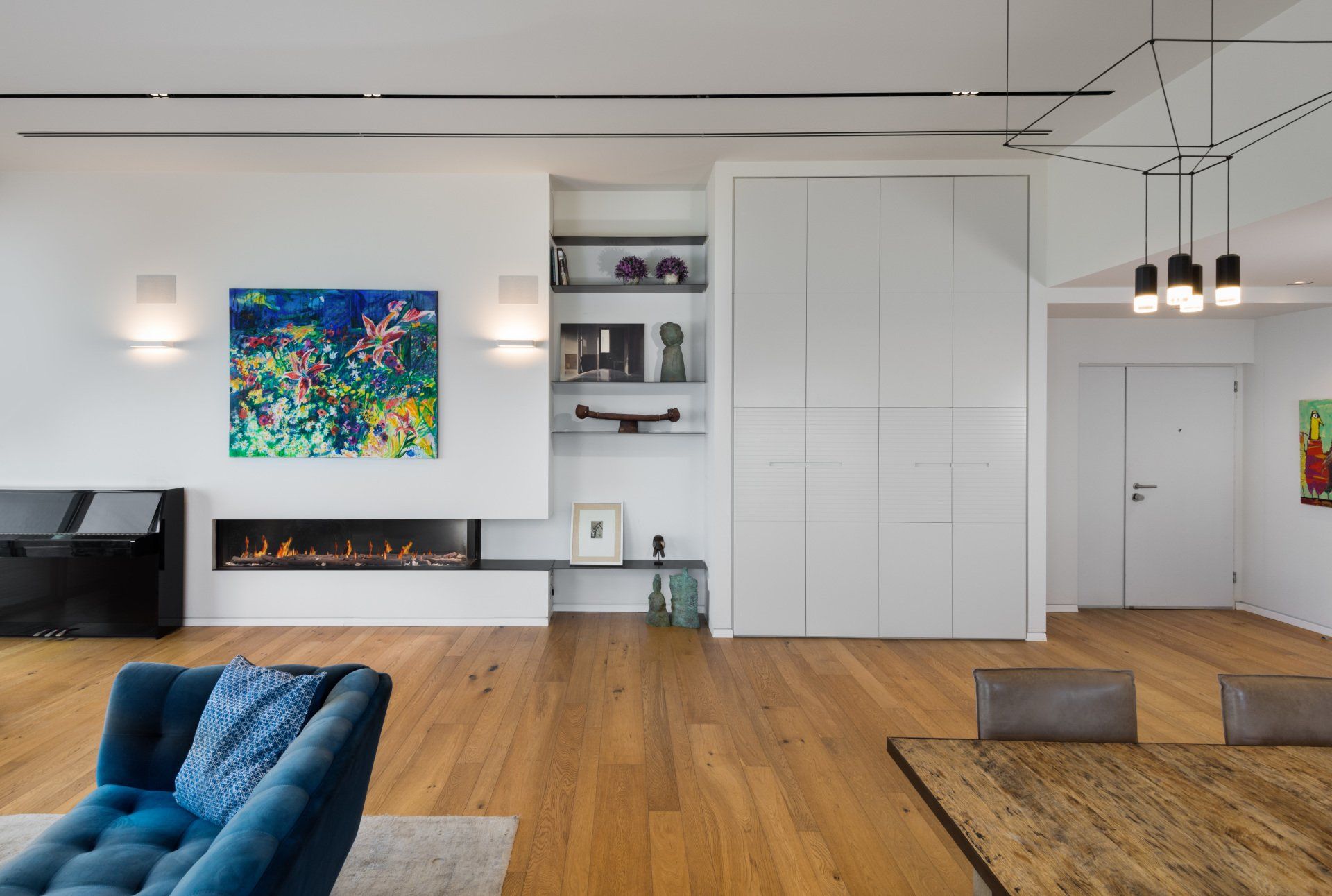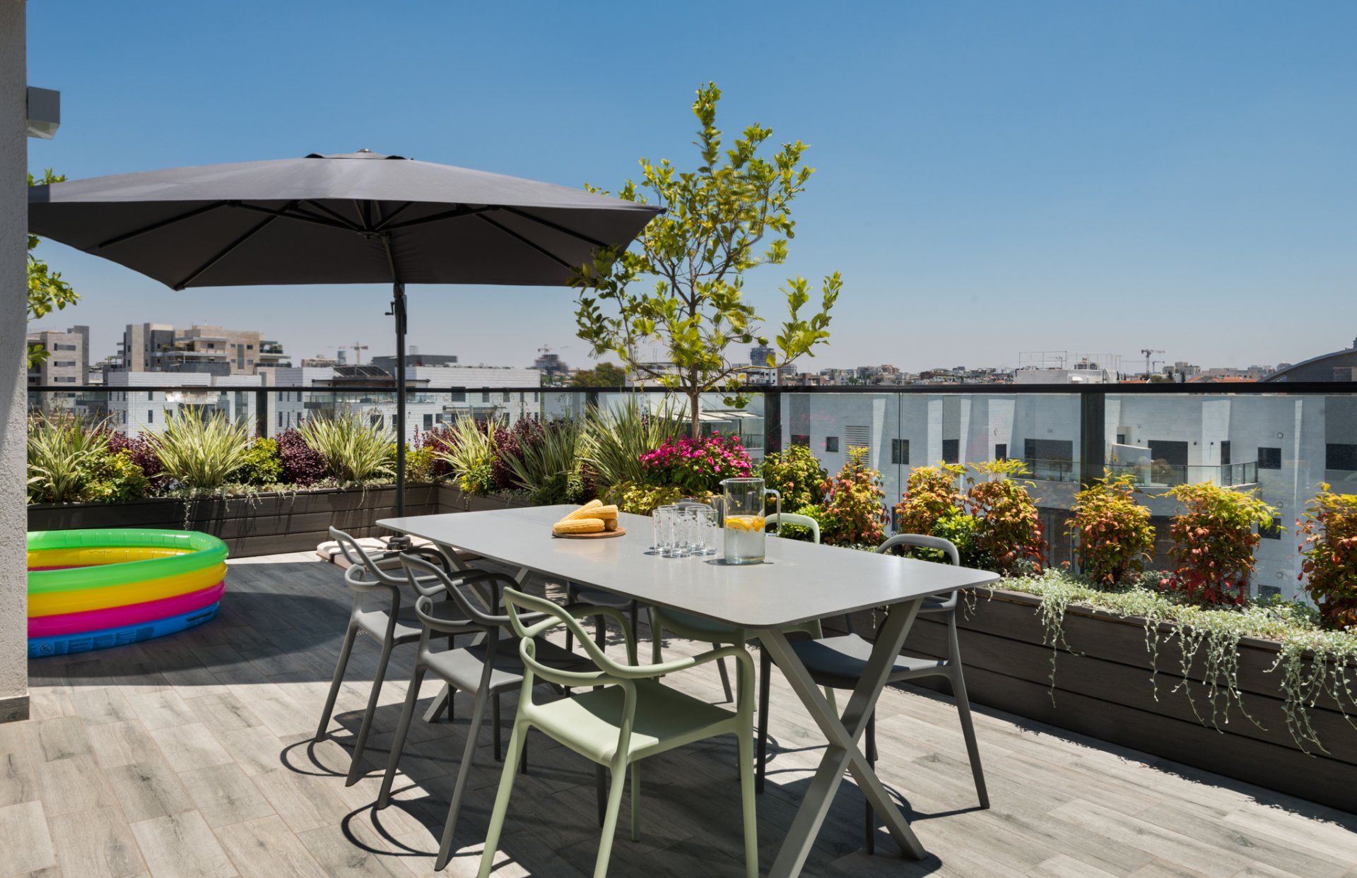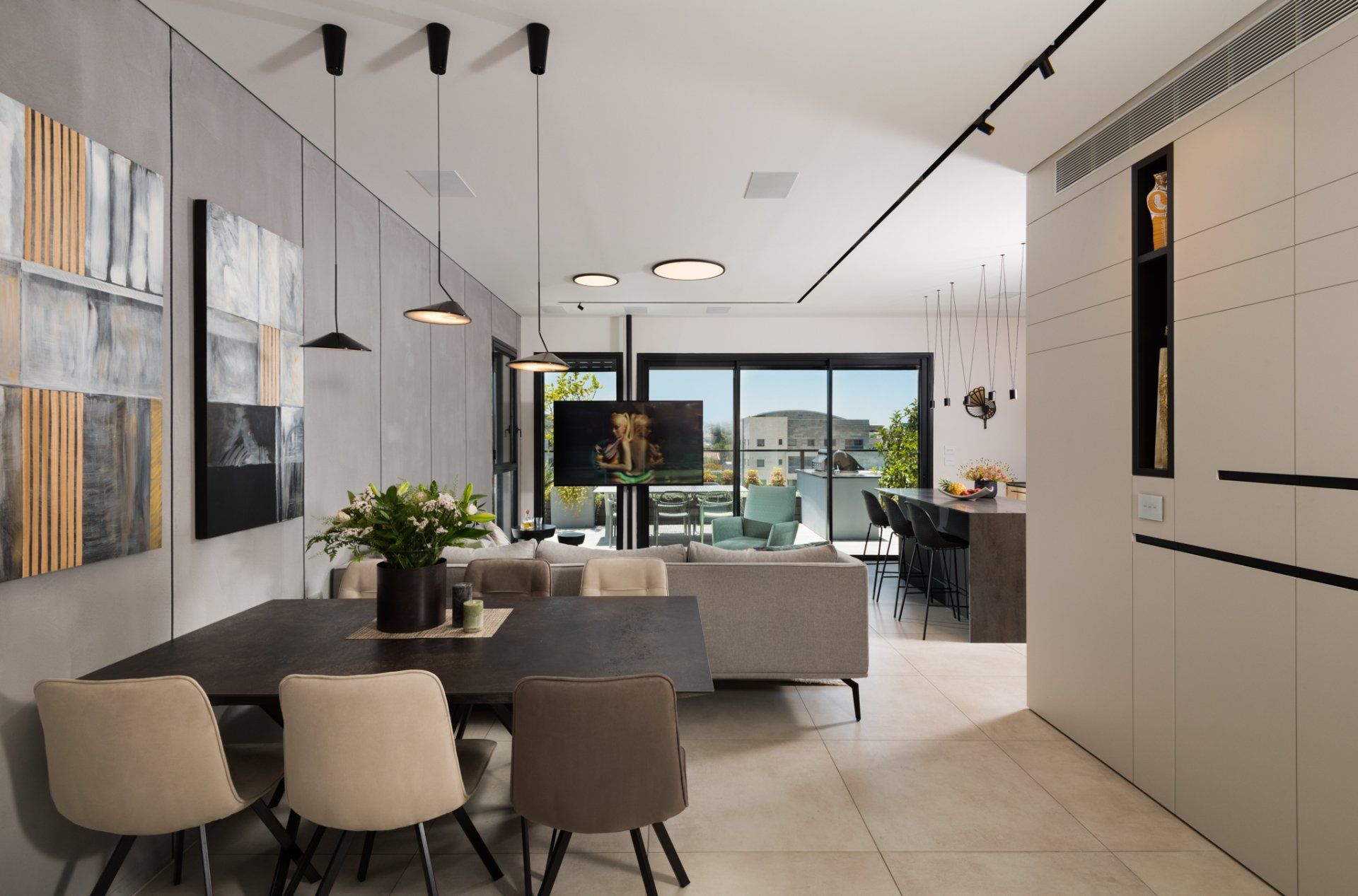 מיני פנטהאוז למשפחה צעירה בסגנון מודרני וצעיר. פלטת החומרים והצבעים משלבת חומרים טבעיים של עץ ובטון אל מול קונטרסט של שחור לבן ושימוש חוזר בצבע ירוק מנטה. חיפוי נגרות, בטון וטפטים משולבים בכל חלקי הדירה ומכניסים פן עיצובי נוסף ודומיננטי בדירה.