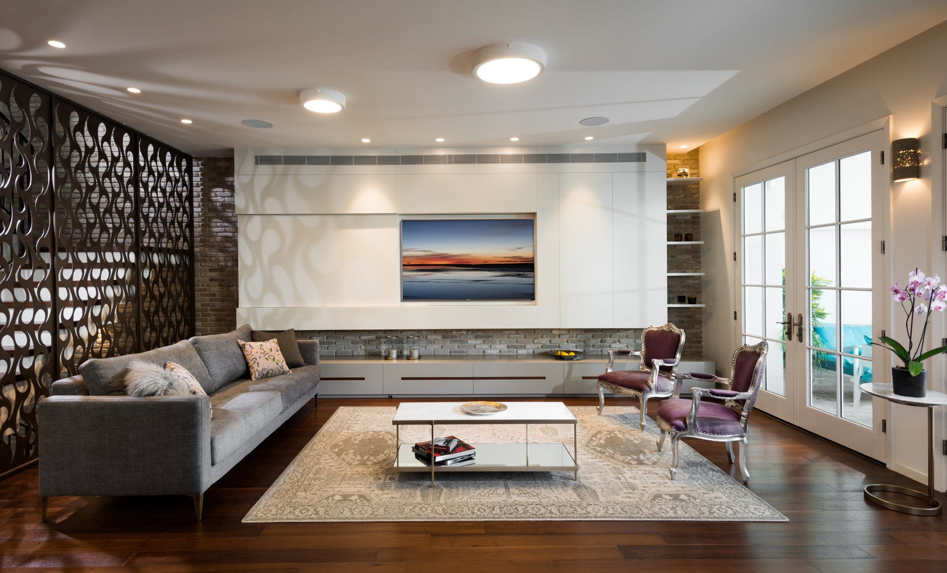 עיצוב מודרני בבית קלאסי. שימוש בגופי תאורה ייחודיים בחלל הכפול בכניסה ובפינת האוכל. שימוש בחיפוי בריקים בקירות מרכזיים בקומת הקרקע כפי שממשיכים את הבריקים בחוץ. קירות פינת האוכל והסלון מינימליסטיים במראה למרות שמסווים בתוכם מערכות מורכבות. חדר הארונות עוצב בהשראת "סקס והעיר הגדולה" עם ארונות זכוכית ותאורה מובנית.